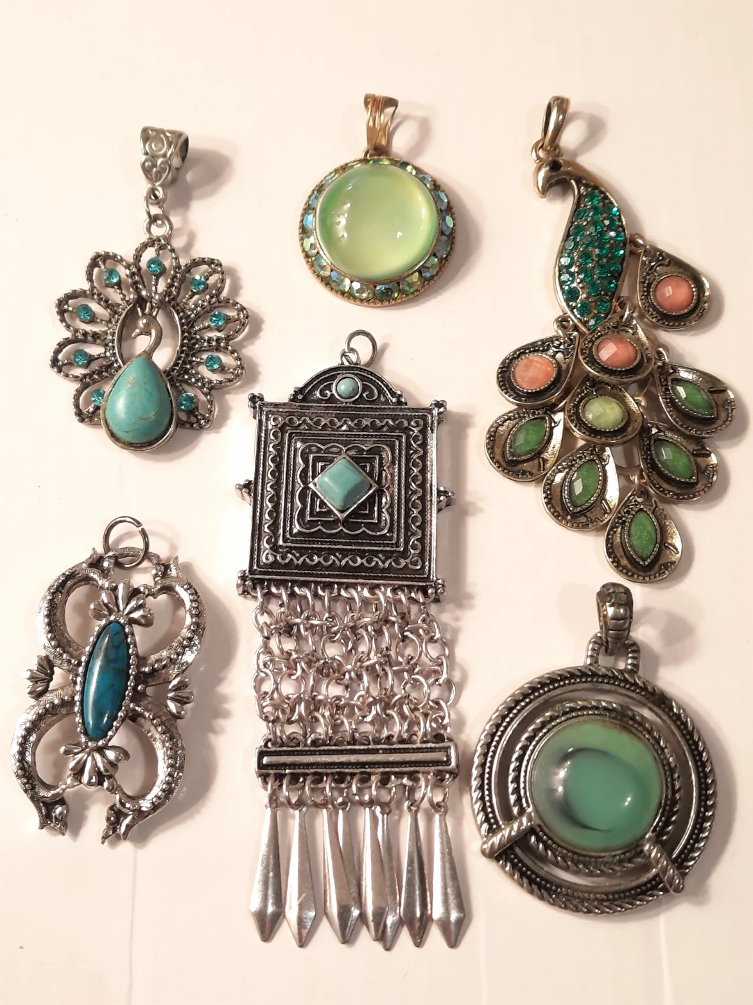 A collection of six unique pendants, featuring various designs and inlaid stones. Includes a peacock-style pendant with green and coral-coloured stones, and a larger circular pendant with a smooth aqua stone. Metal is silver-toned. These pendants are great for adding a statement piece to an outfit.akazing blue green and turquoise pendants ..