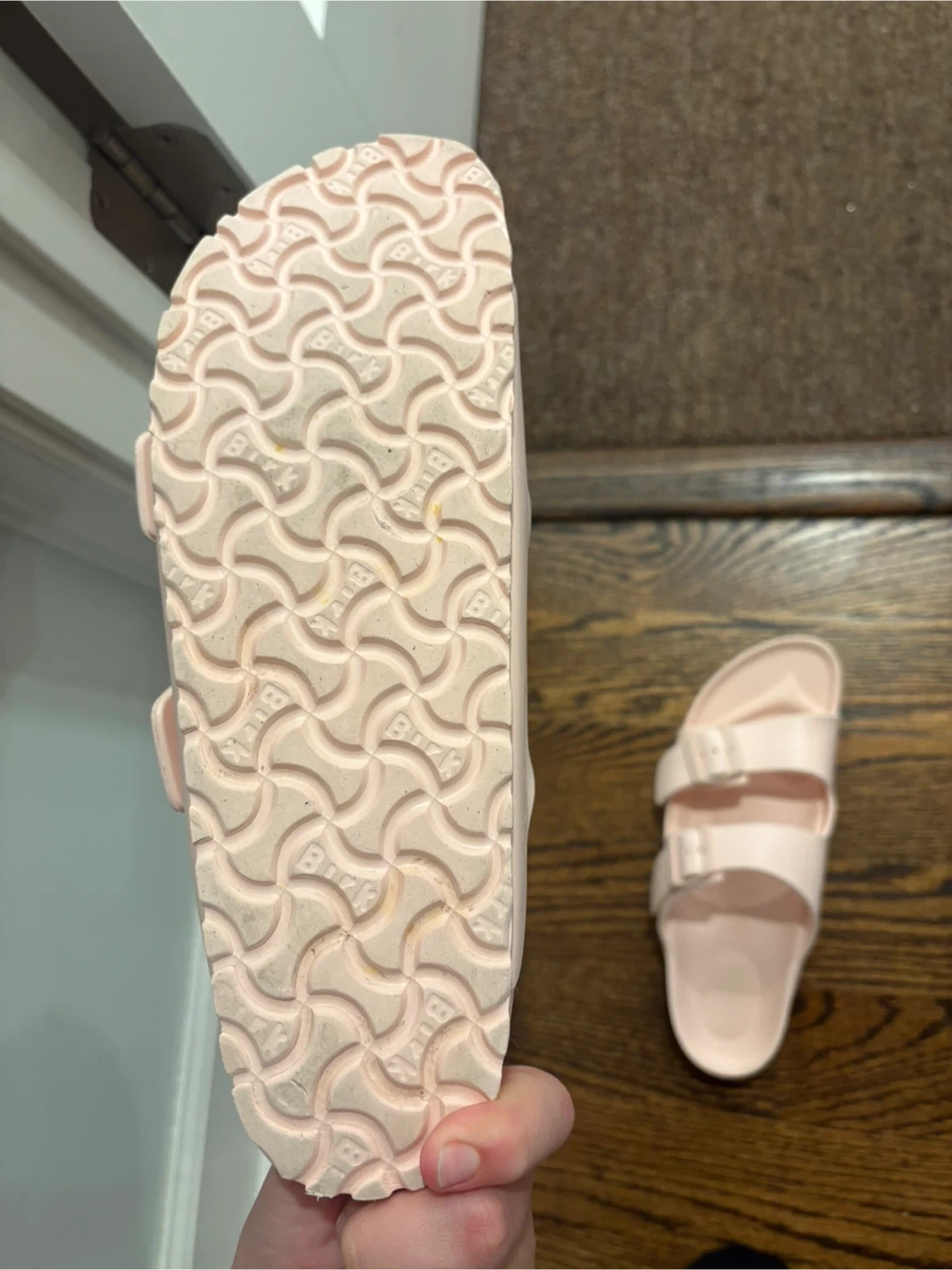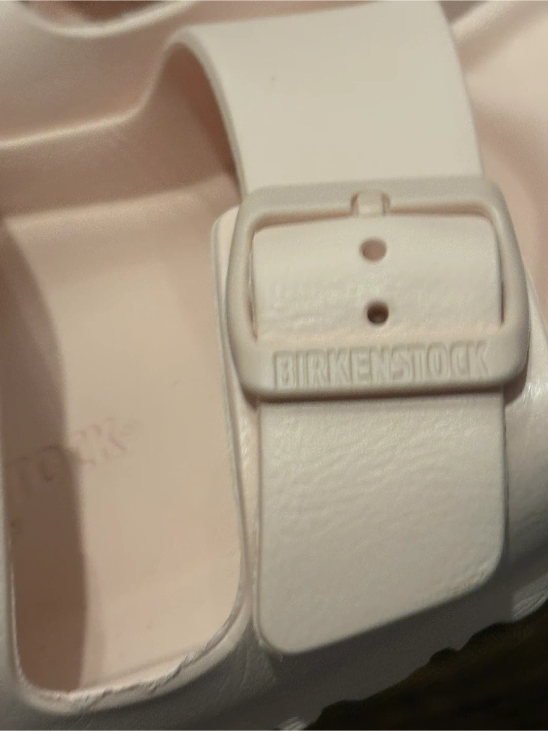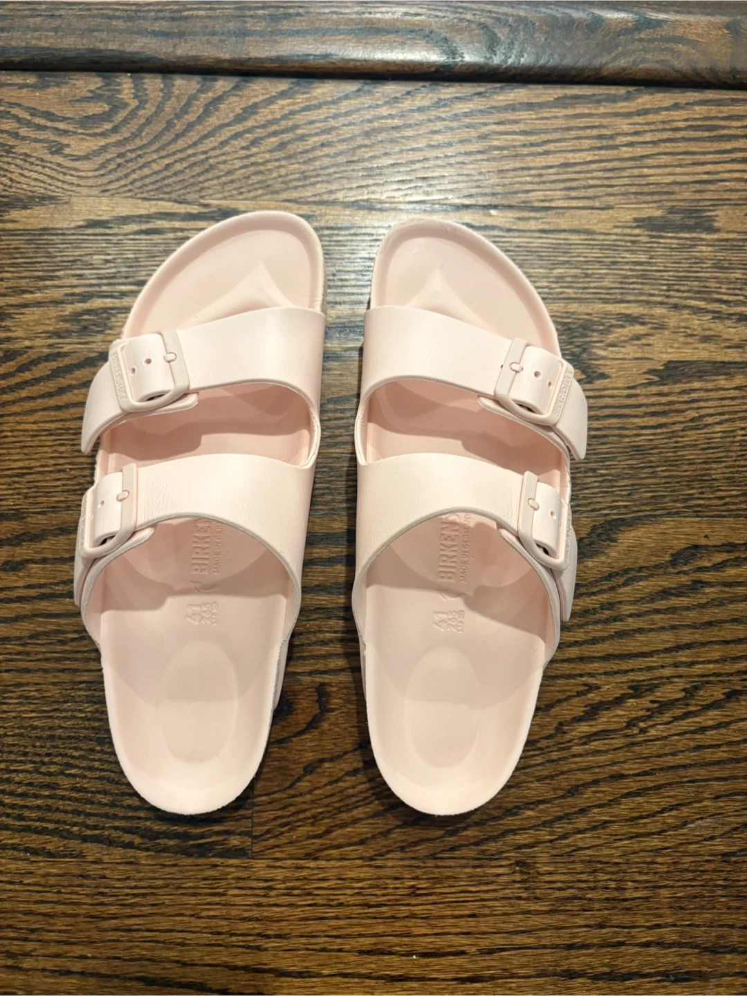 Birkenstock Arizona sandals in a light pink color. Made from EVA material. These are size 41 and were made in Germany. They feature adjustable straps with buckles. Like new