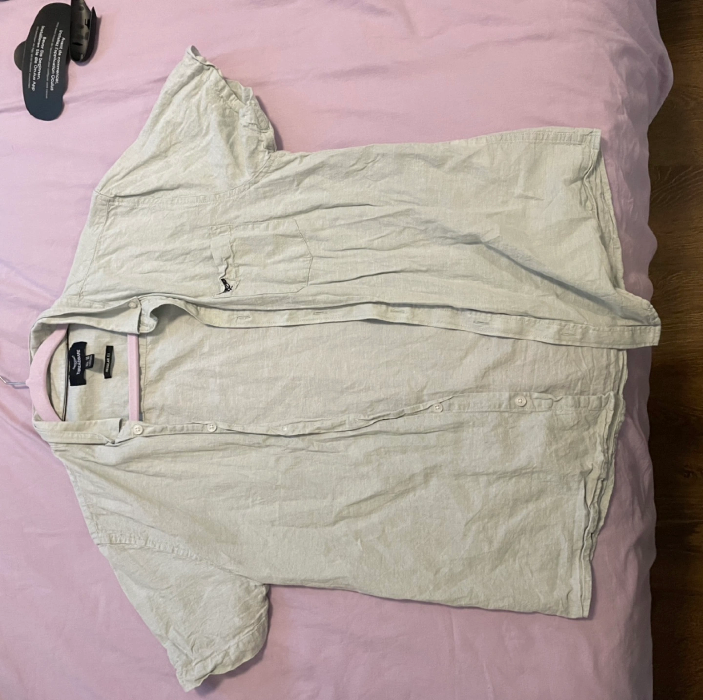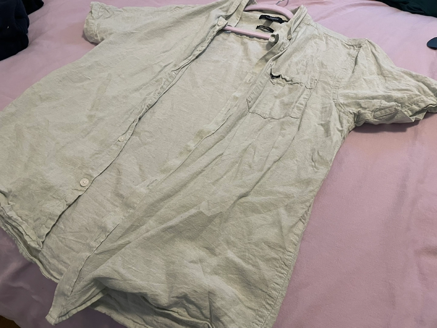 Men's short sleeve button-up shirt. Light green colour. Regular fit. Small chest pocket. Made in Bangladesh.