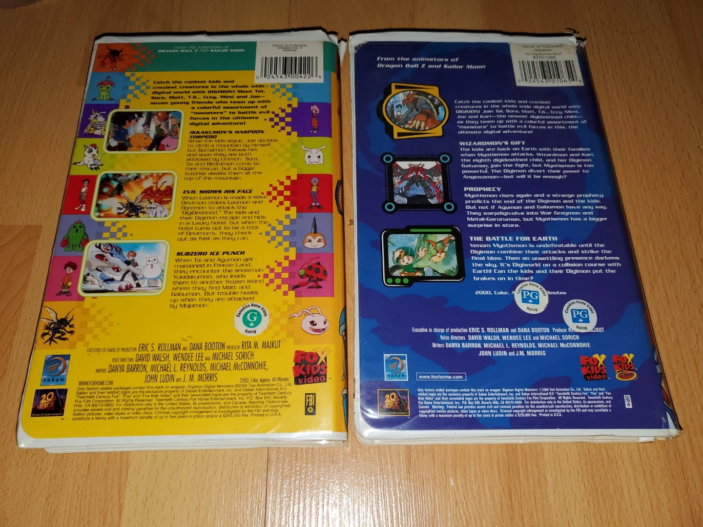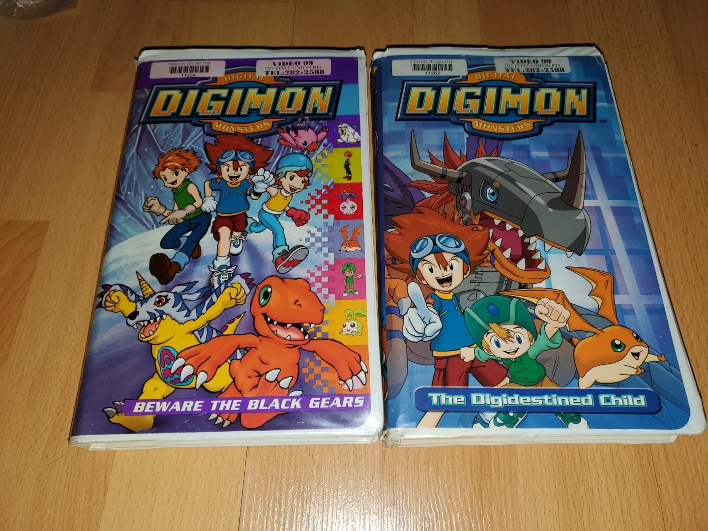 Two VHS tapes featuring Digimon Digital Monsters episodes. Includes Volume 2 "Beware the Black Gears" and Volume 3 "The Digidestioned Child". Both tapes are approximately 60 minutes long. Released in 2000.