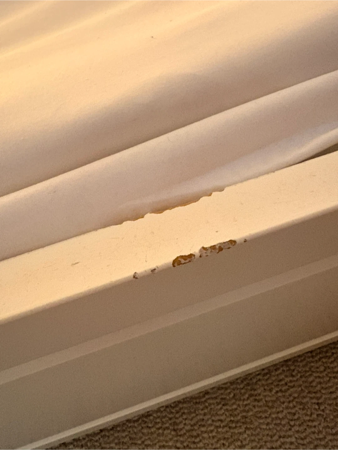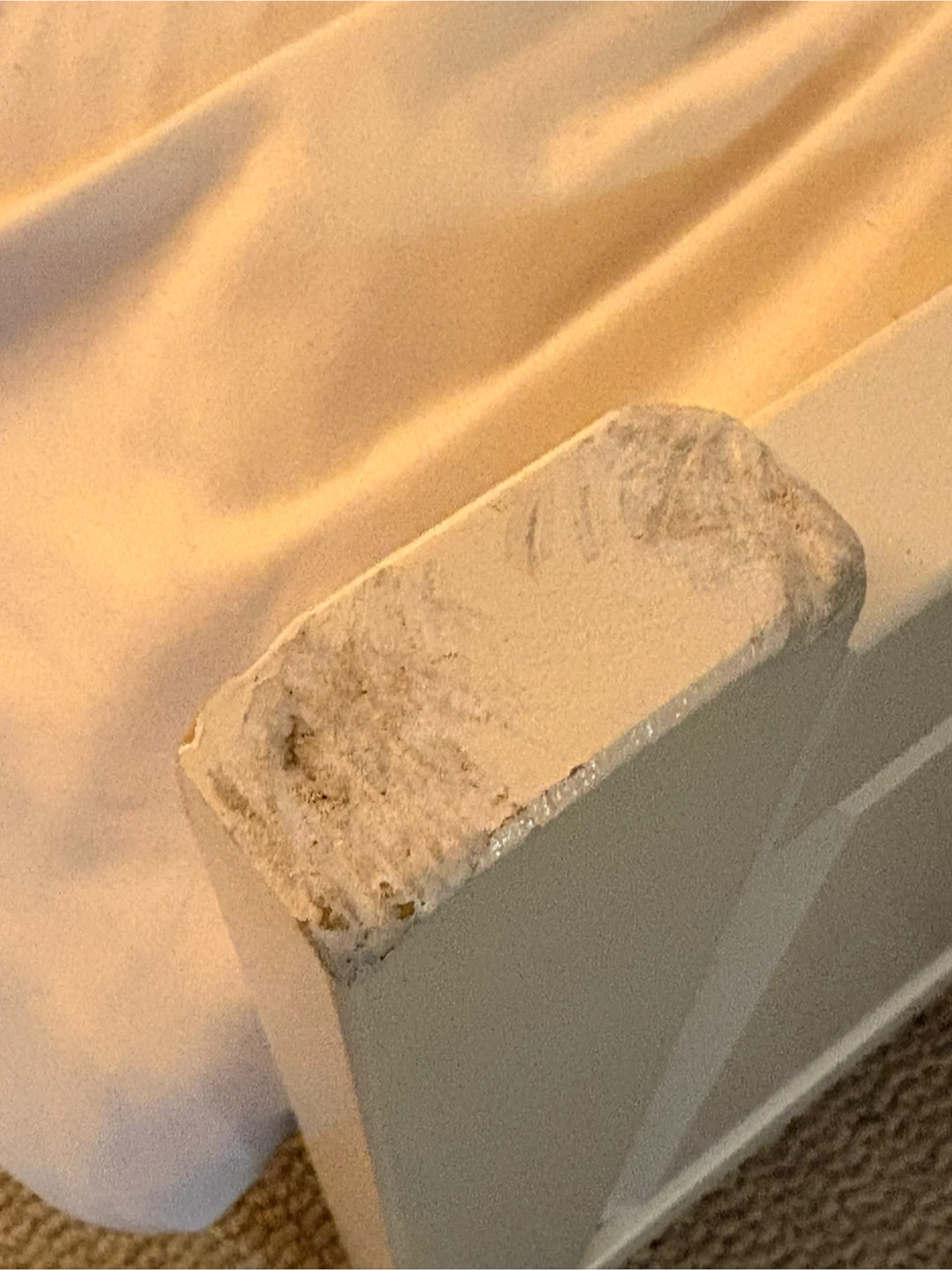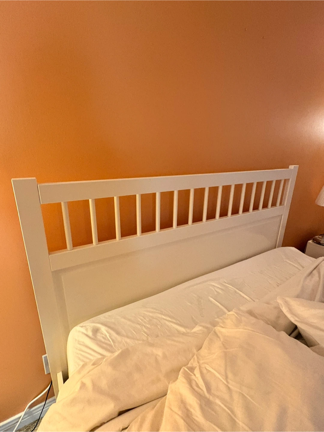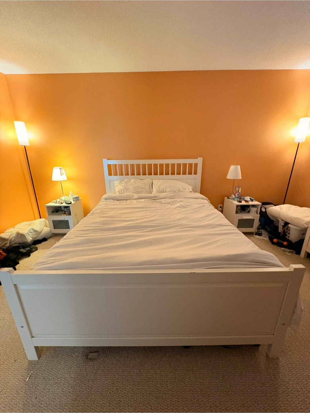 Selling a white wooden bed frame from IKEA. It's a classic slatted headboard design. Shows some wear and tear on the corners and edges, as pictured. This frame would be great for a bedroom needing a simple and clean aesthetic. (Mattress and bedding not included, pickup only)