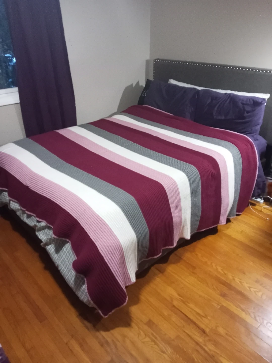 Cozy handmade crochet blanket 100% cotton with bold stripes. Colours include burgundy, grey, pink, and cream. Perfect for adding a touch of warmth and style to your bedroom.