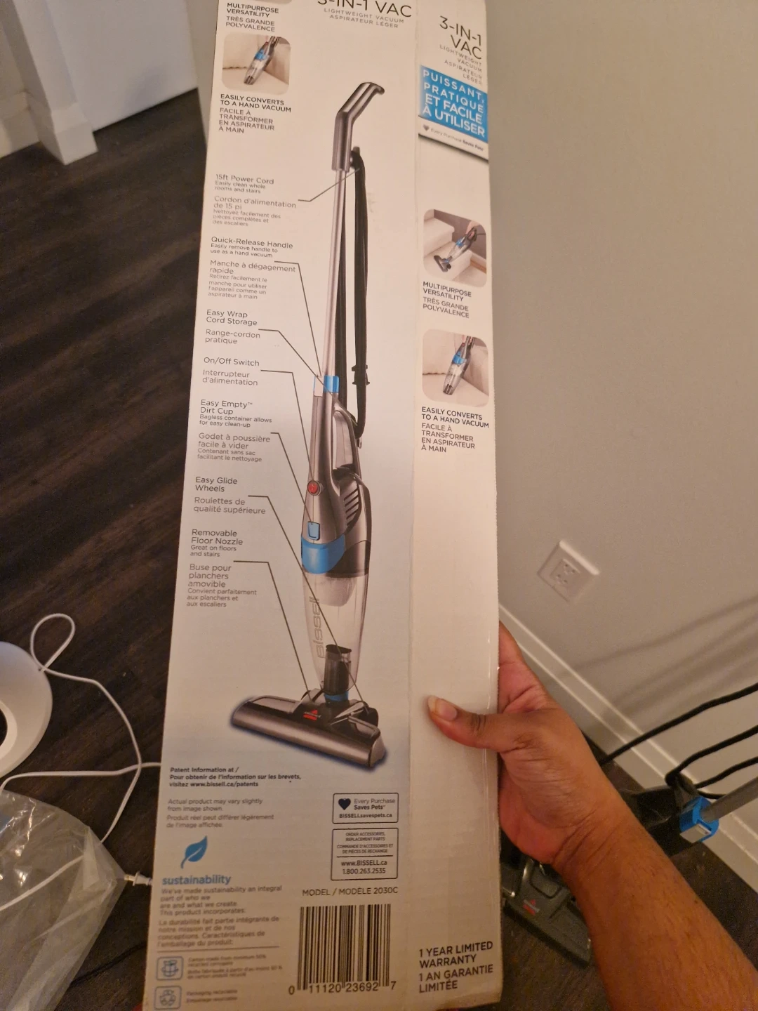 This Bissell 3-in-1 vacuum converts easily to a hand vacuum. It has a 15ft power cord and easy glide wheels. A little dusty from use. Comes with the box if you want it.
