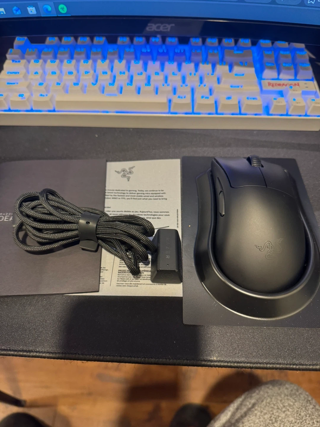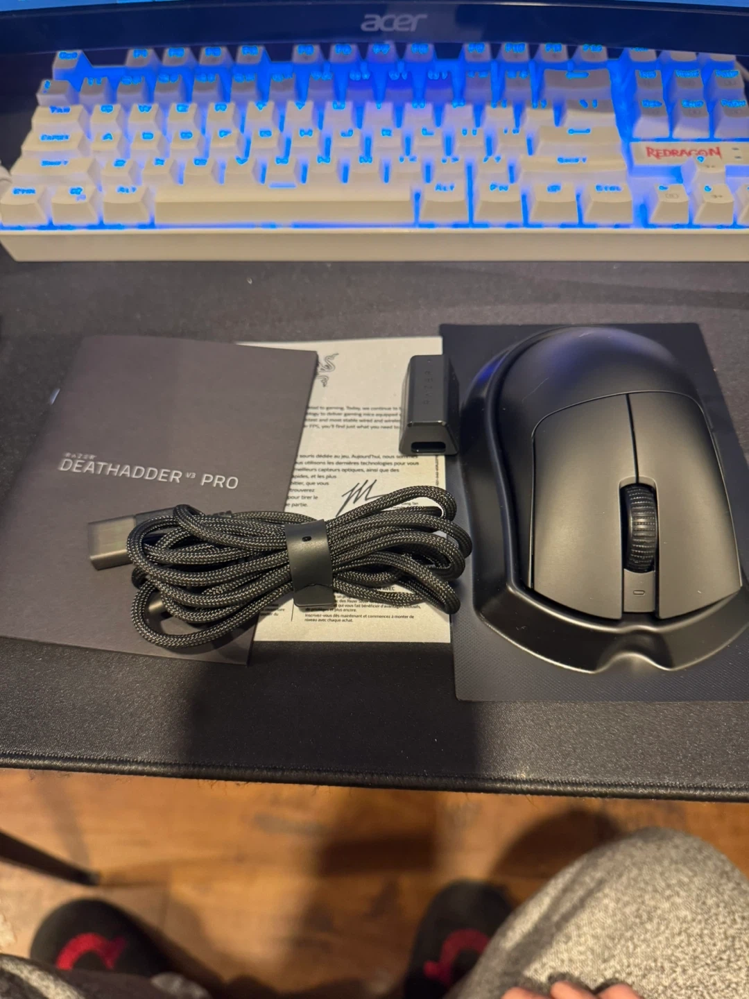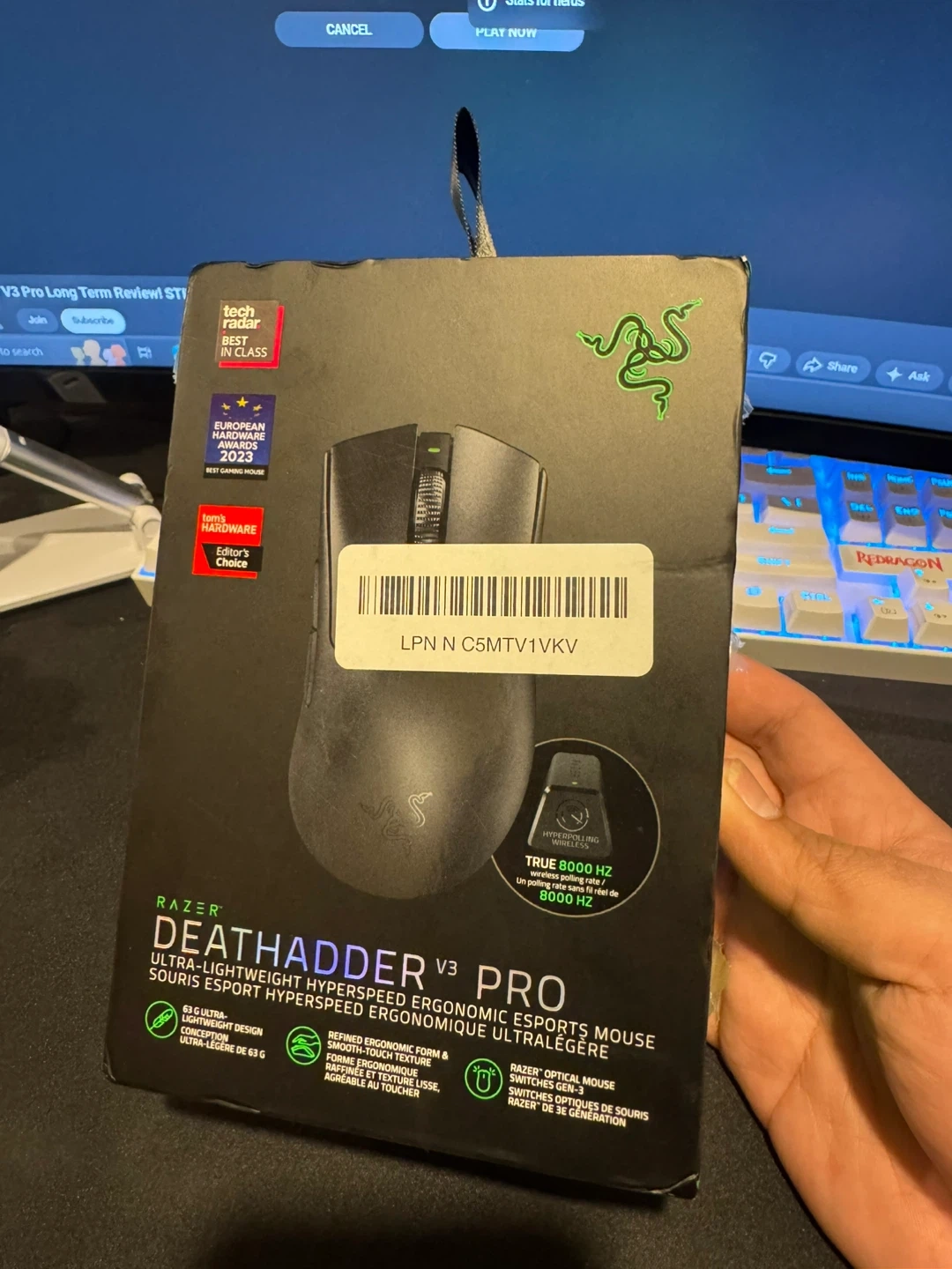 This is the Razer Deathadder V3 Pro gaming mouse. It's ultra-lightweight and features hyperspeed wireless for a lag-free experience. It supports true 8000 Hz polling rate for maximum responsiveness. Includes original box, charging cable, and USB dongle.