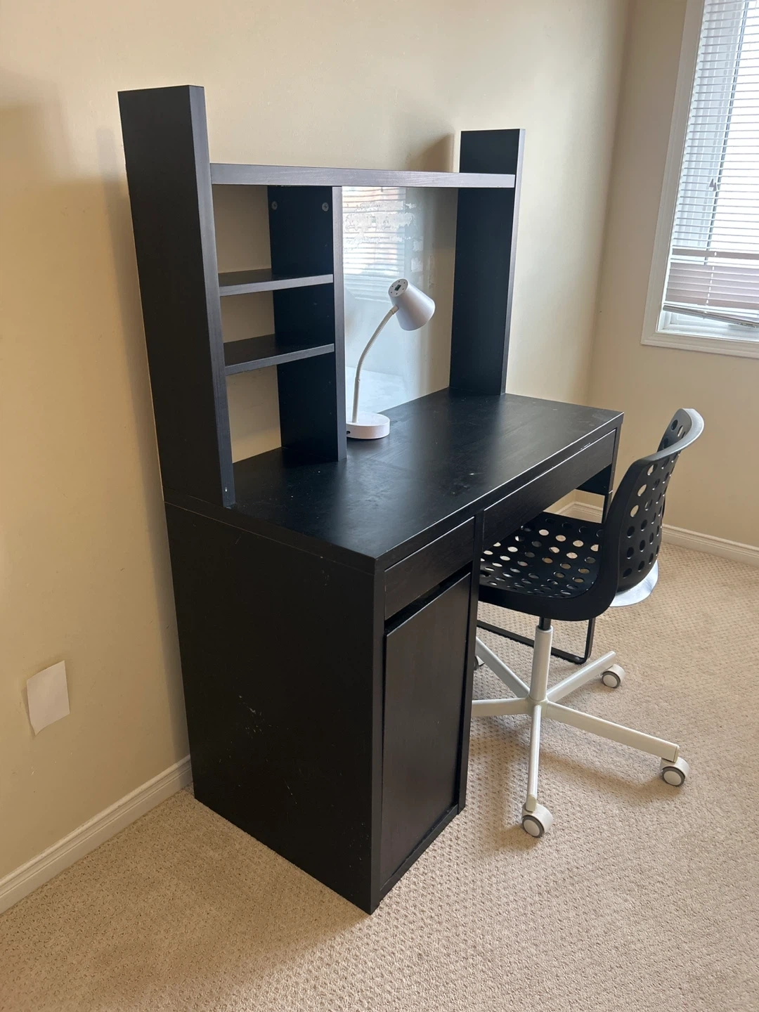IKEA Compact black desk featuring a hutch with shelves. Includes a rolling desk chair with a perforated seat and back. The desk has a cabinet on the side for storage. It's a functional setup for a student or small workspace.