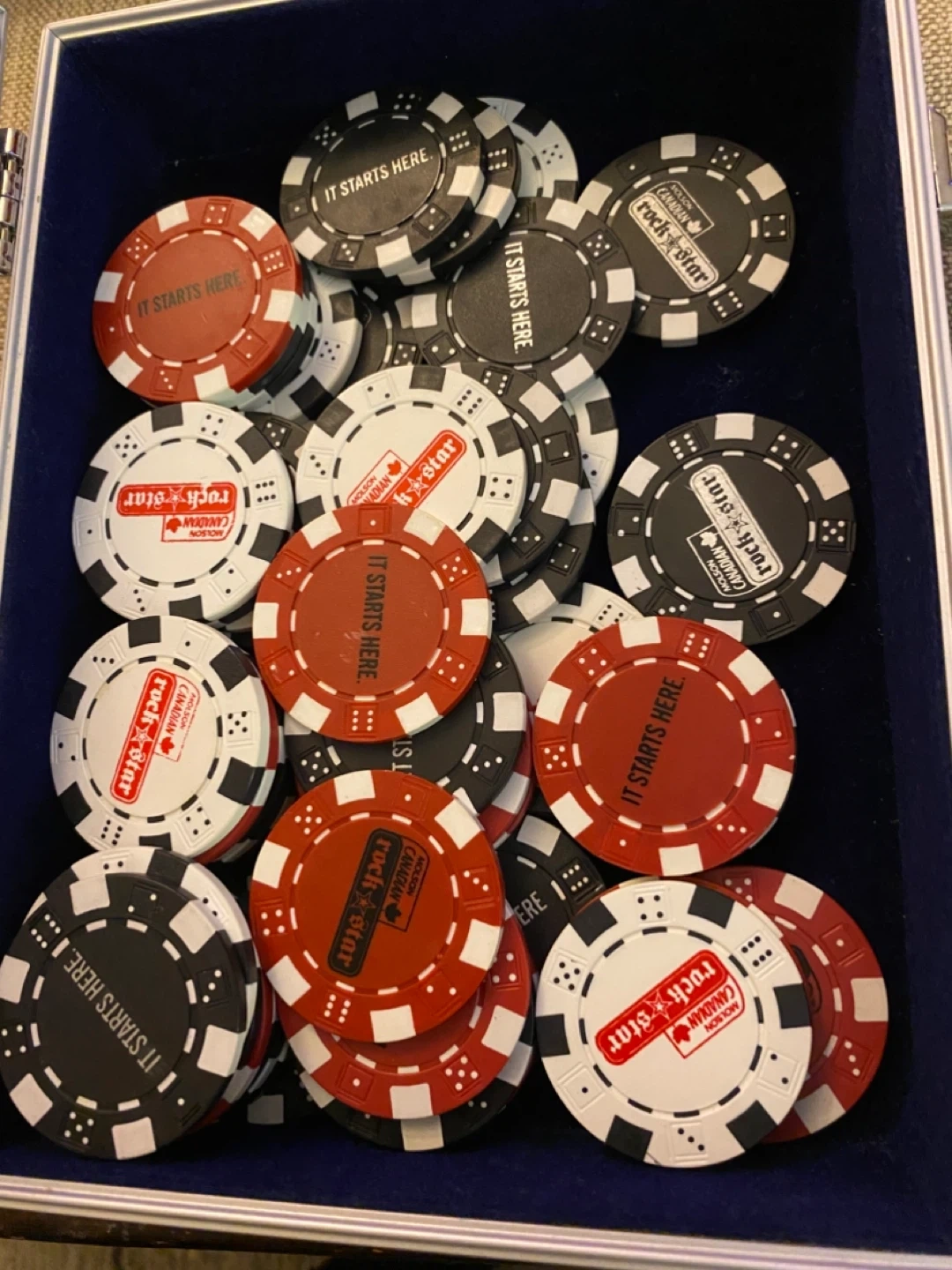 Set of Molson Canadian Rock Star poker chips. Features "It Starts Here" and "Rock Star" branding. Includes red, black, and white chips.