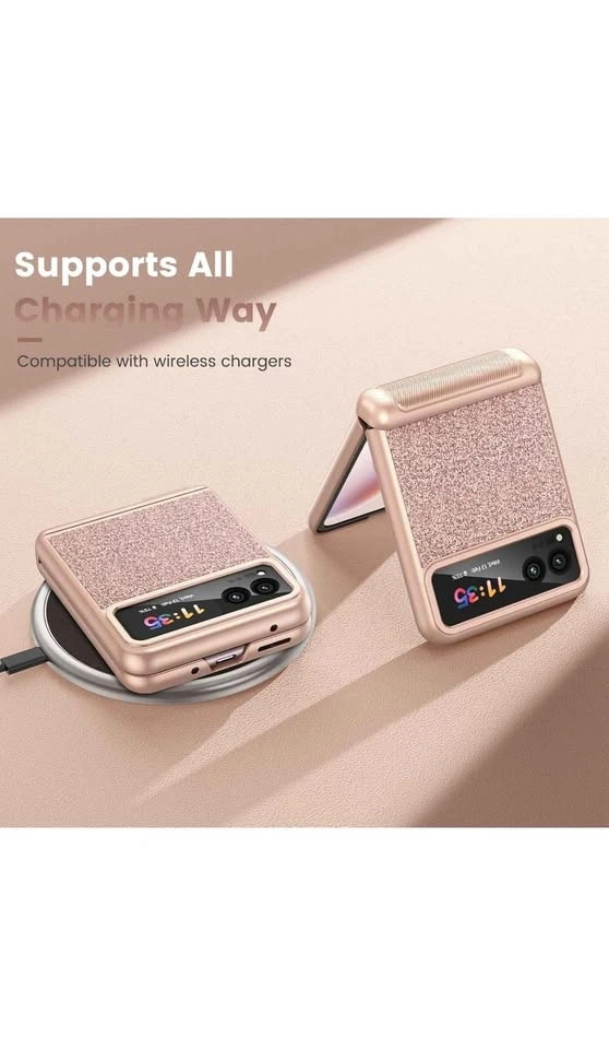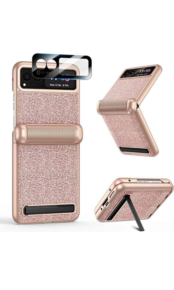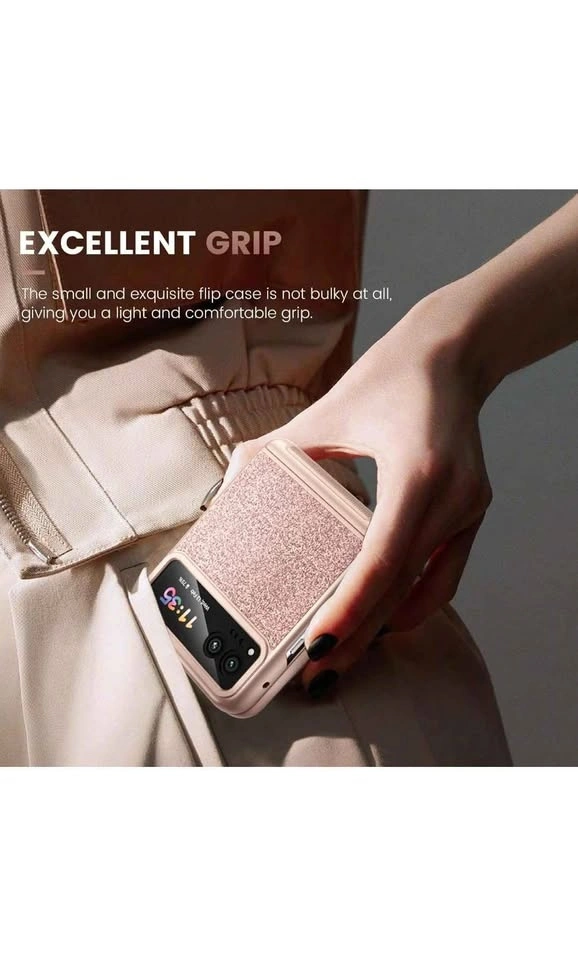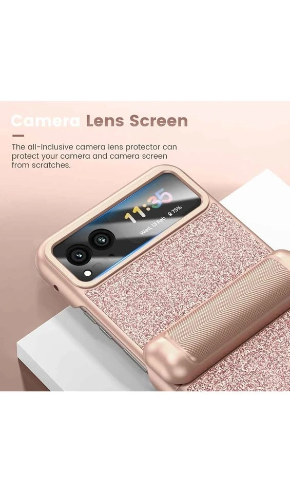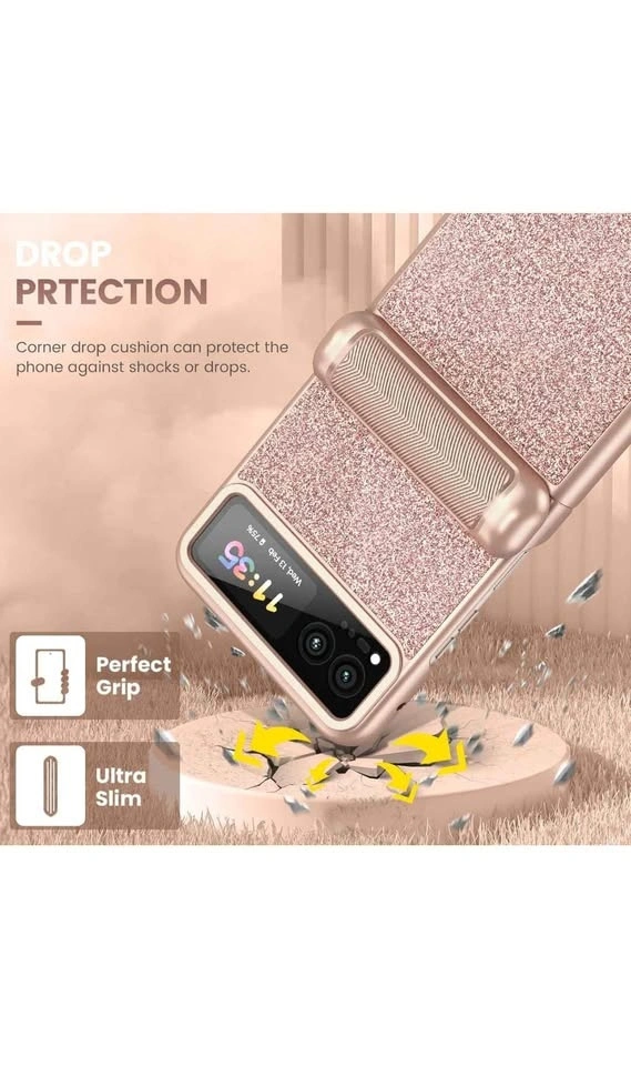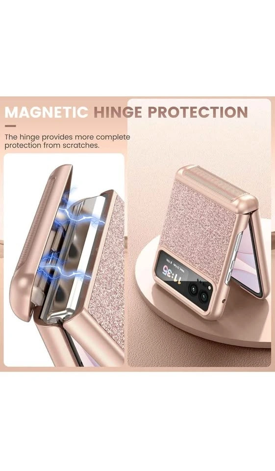 This is a VEGO case for the Motorola Razr 2023. It features hinge protection, a built-in kickstand, and an ultra-HD camera screen protector. The color is Rose Pink and it has a sparkly, glittery design, making it a cute and slim cover for women.
