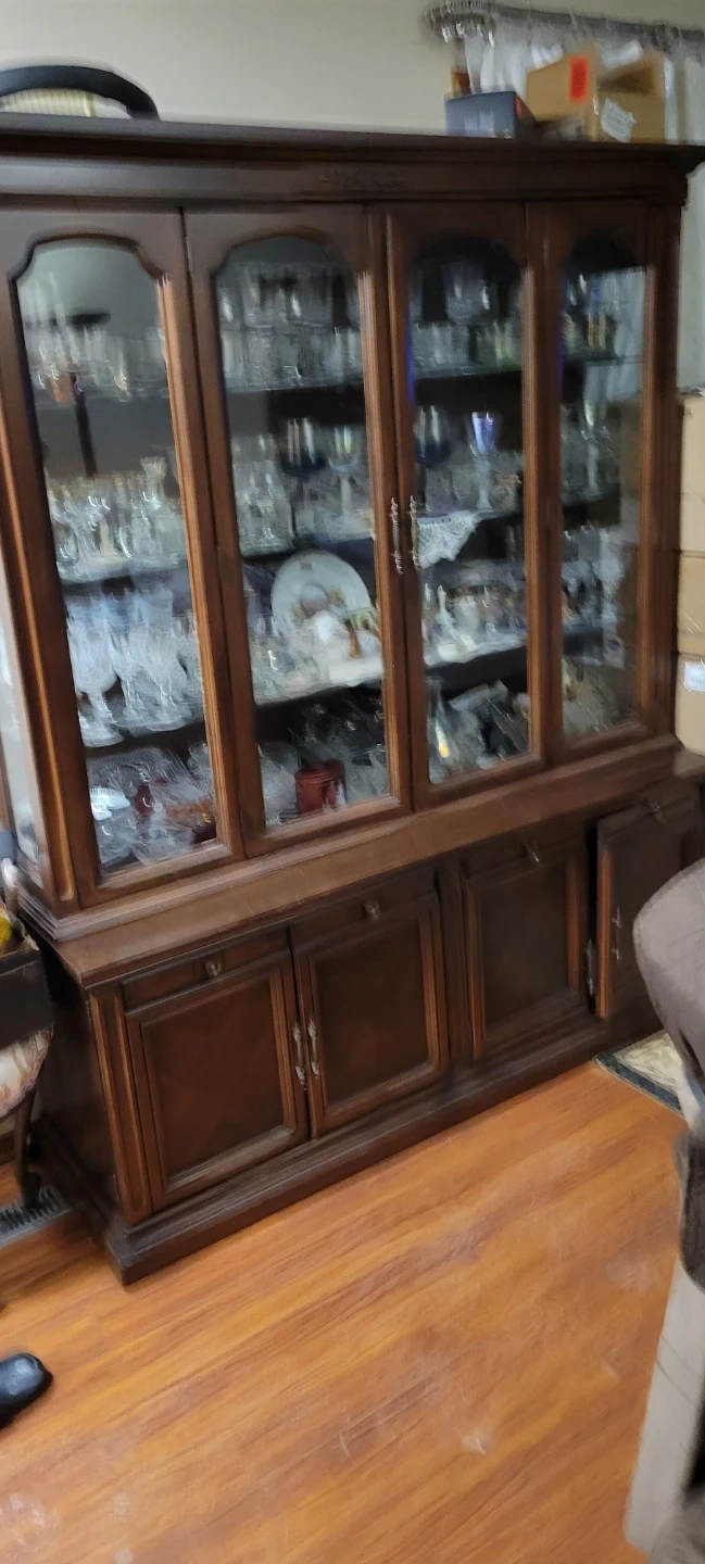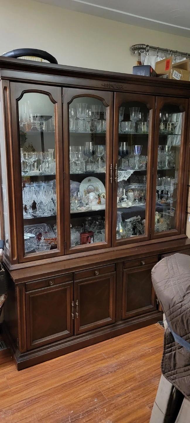Selling a dark brown china cabinet. It has glass doors on top and wooden doors on the bottom. Great for displaying your favourite dishes and glassware! Will include all crystal and glassware if you want for a little bit extra?.