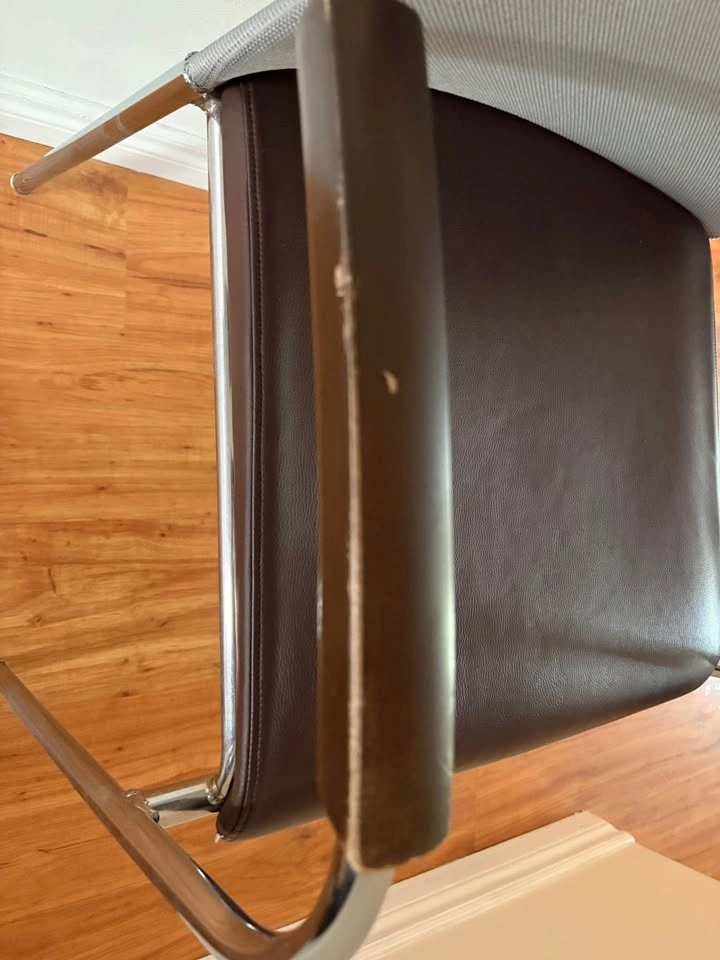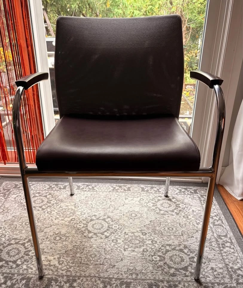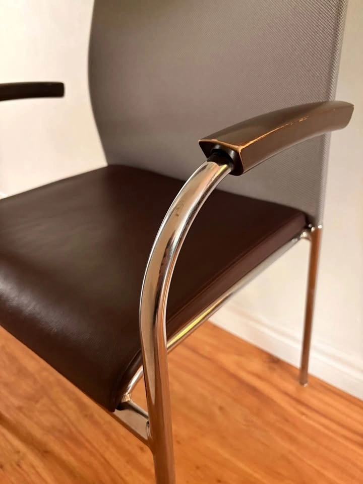 Chrome frame. Brown leather seat & Grey fabric. These are classics and very comfortable. Reduced to $50, FIRM. Pickup only in Burlington. (Pinedale)