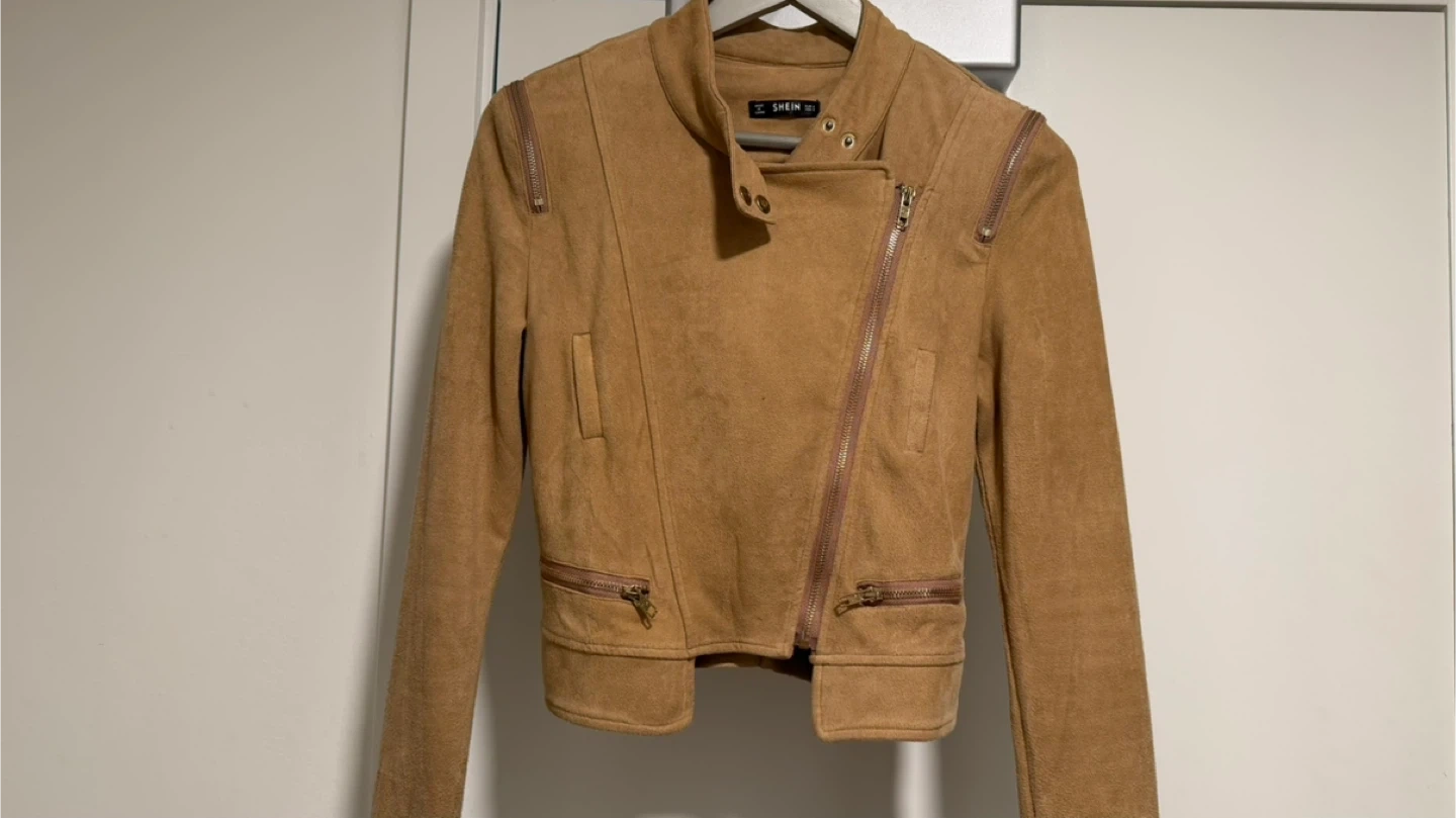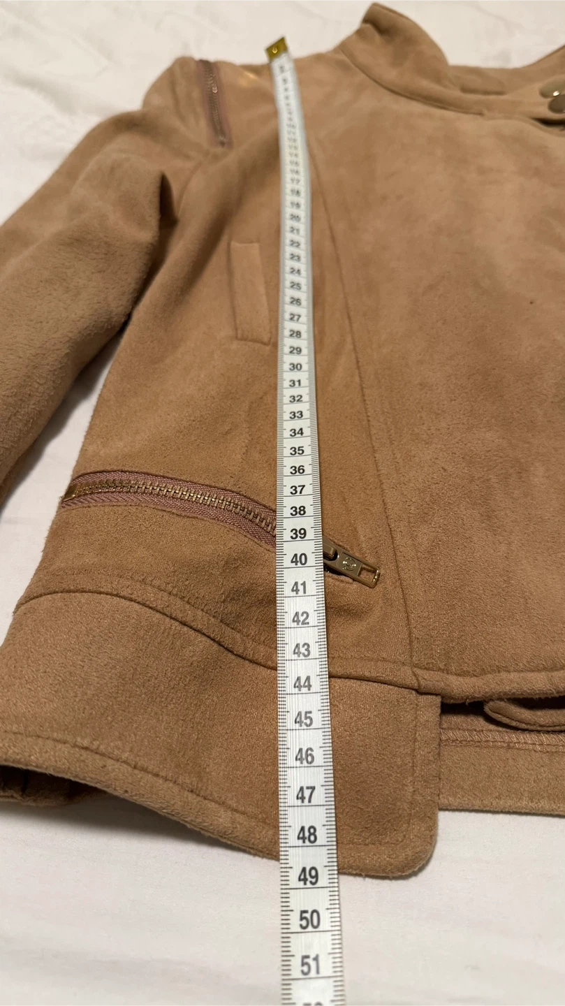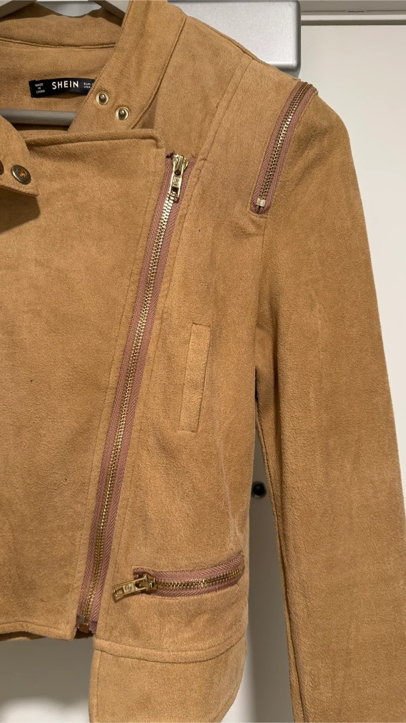 Selling a tan, suede-like moto jacket! It features an asymmetrical zipper closure and zippered pockets. Perfect for adding a bit of edge to any outfit!
