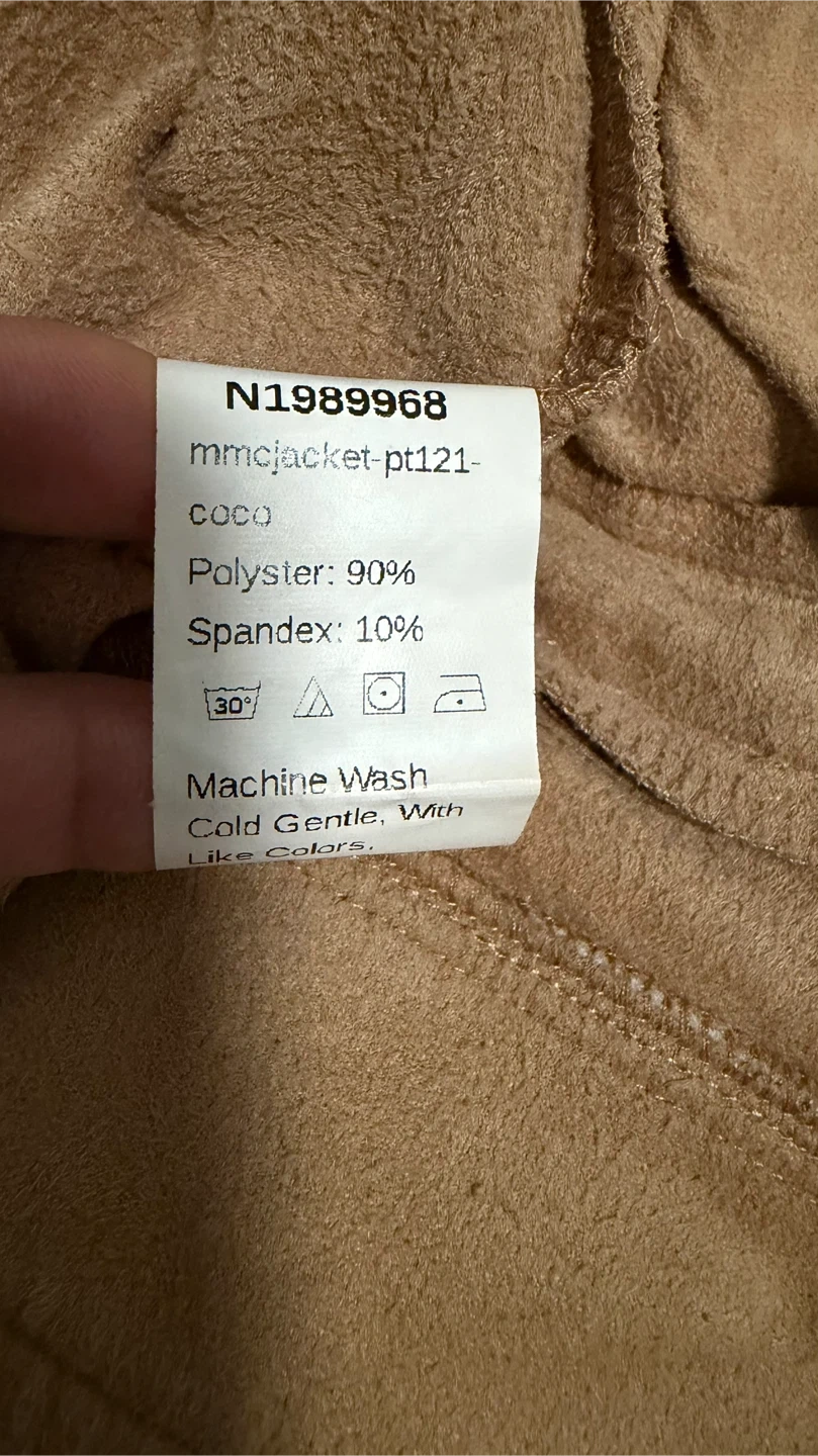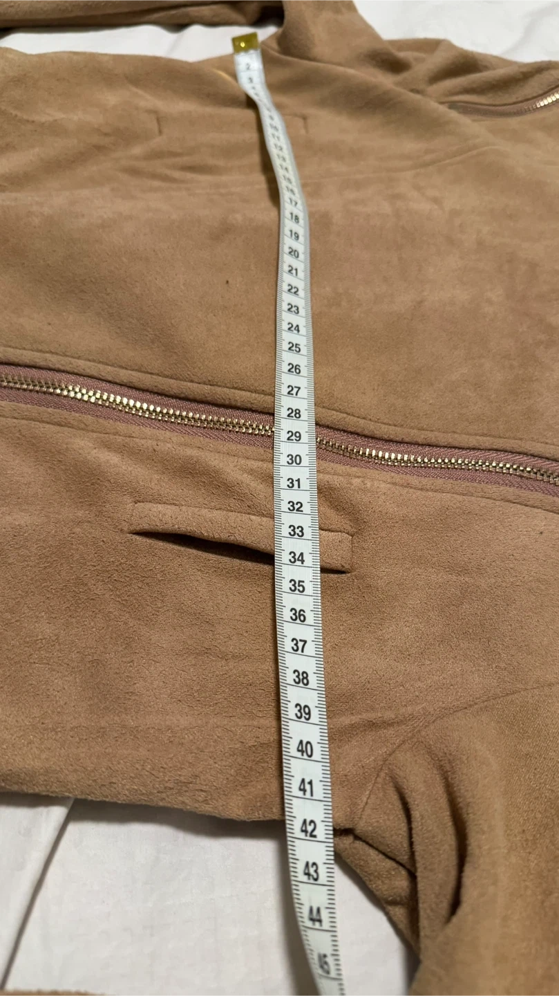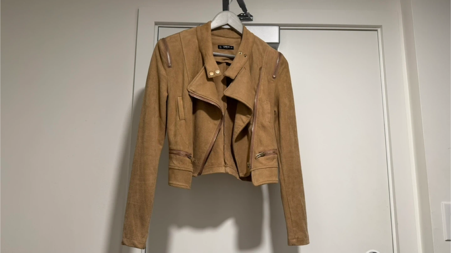Selling a tan, suede-like moto jacket! It features an asymmetrical zipper closure and zippered pockets. Perfect for adding a bit of edge to any outfit!