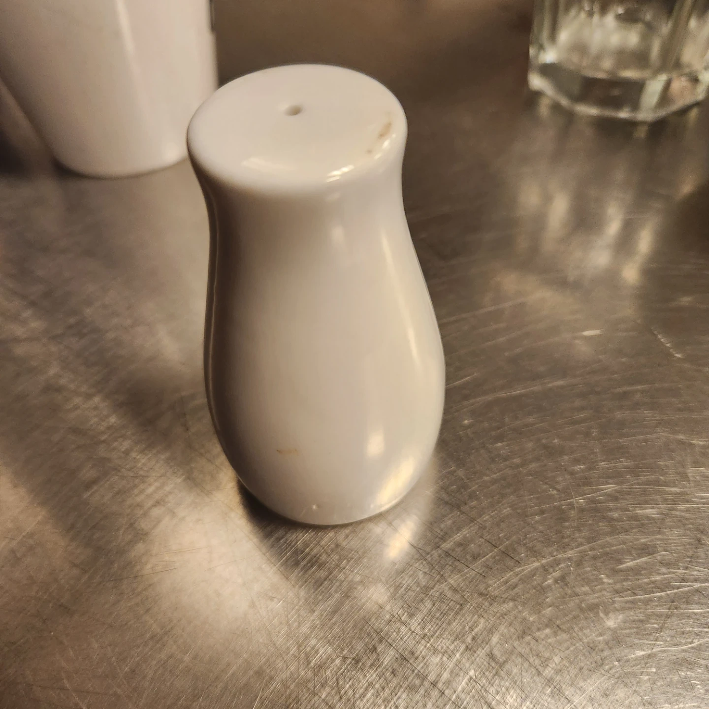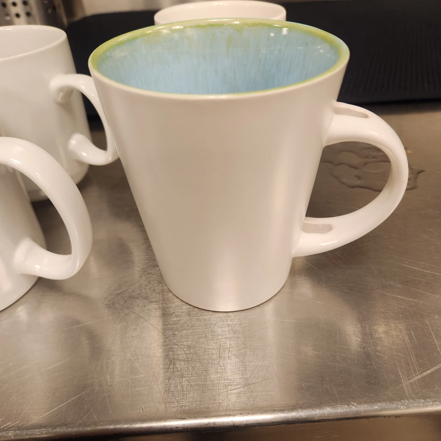 Set includes white ceramic mugs and one glass. One mug has a blue interior. Also includes a salt shaker.