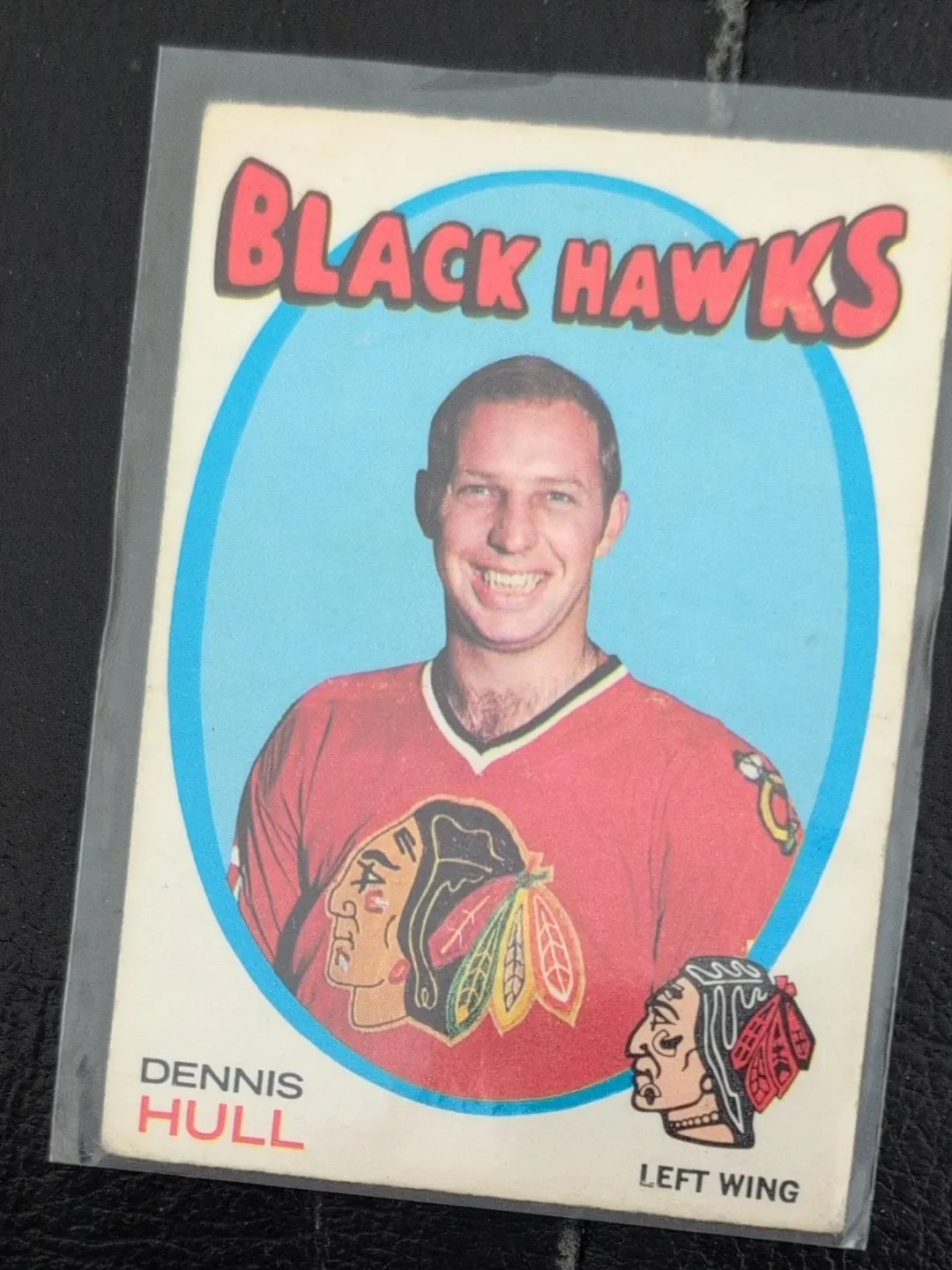 Dennis Hull Chicago Blackhawks hockey card. It's a vintage collectible featuring the player. The card shows the team's logo and the player's name and position.