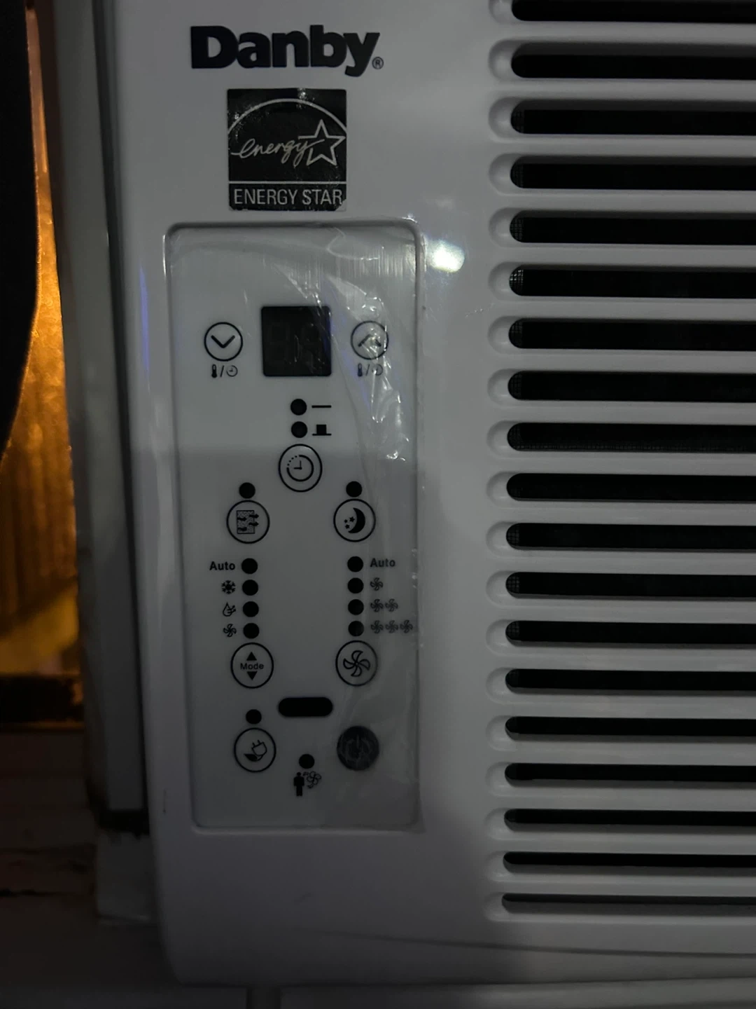 This is a Danby window air conditioner. It's white and has multiple settings including auto, cool, fan, and dehumidify. It's Energy Star rated. It's perfect for keeping a room cool during warmer months!