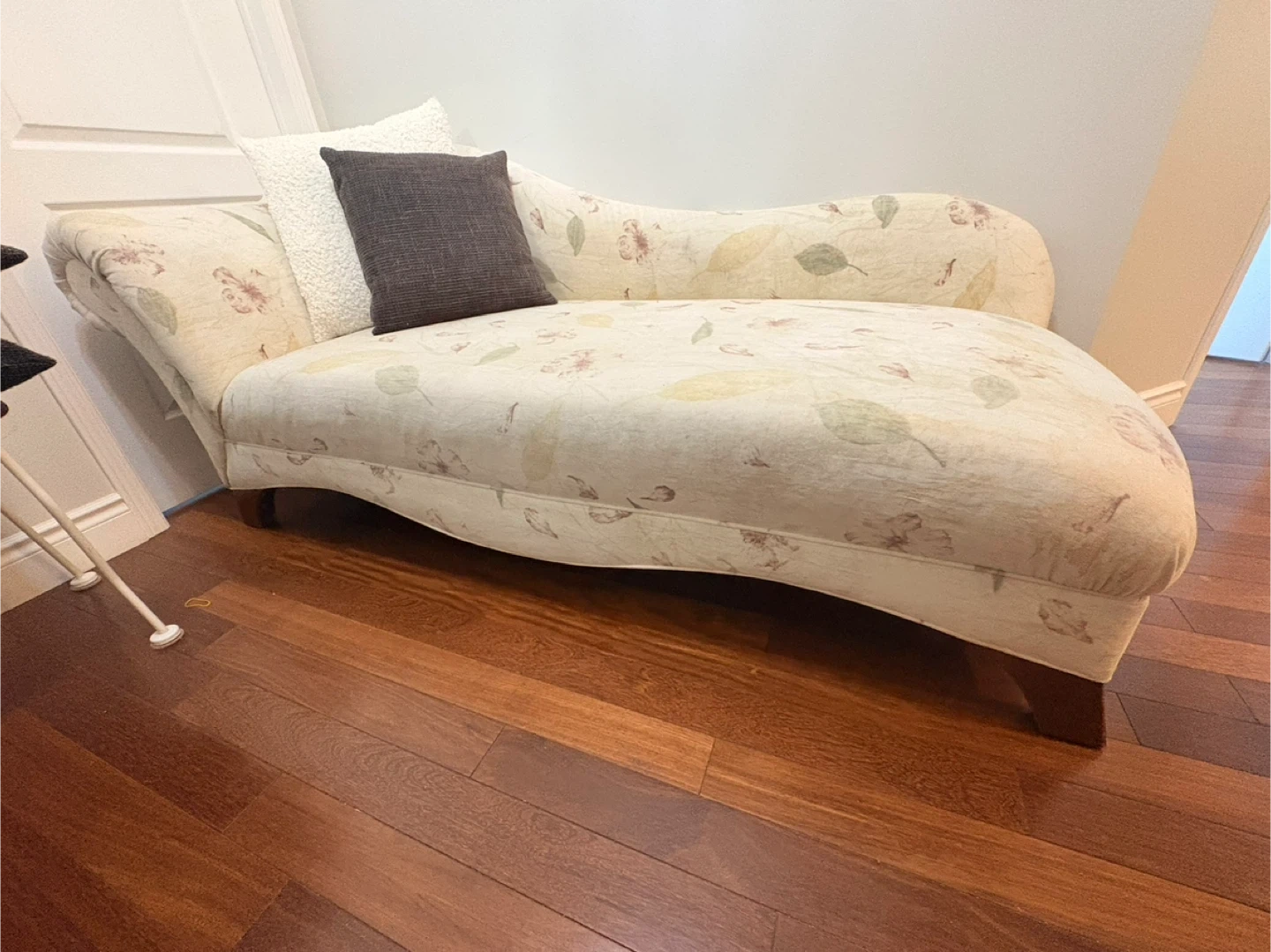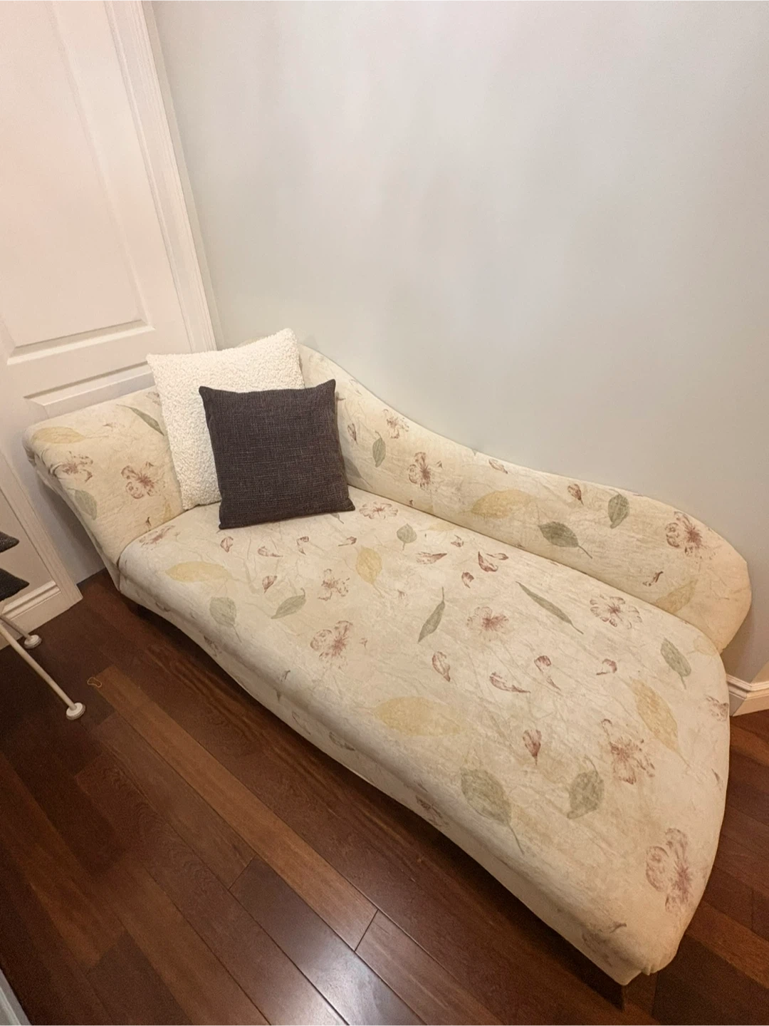Cozy Chaise Lounge โ $100 or nearest cash offer. ๐ธ Beautiful chaise lounge with floral upholstery. Super comfy and perfect for reading, relaxing, or even as an extra spare bed; adding a touch of charm to your space. โจ Gently used, in great condition โจ Unique curved design ๐ Pickup only