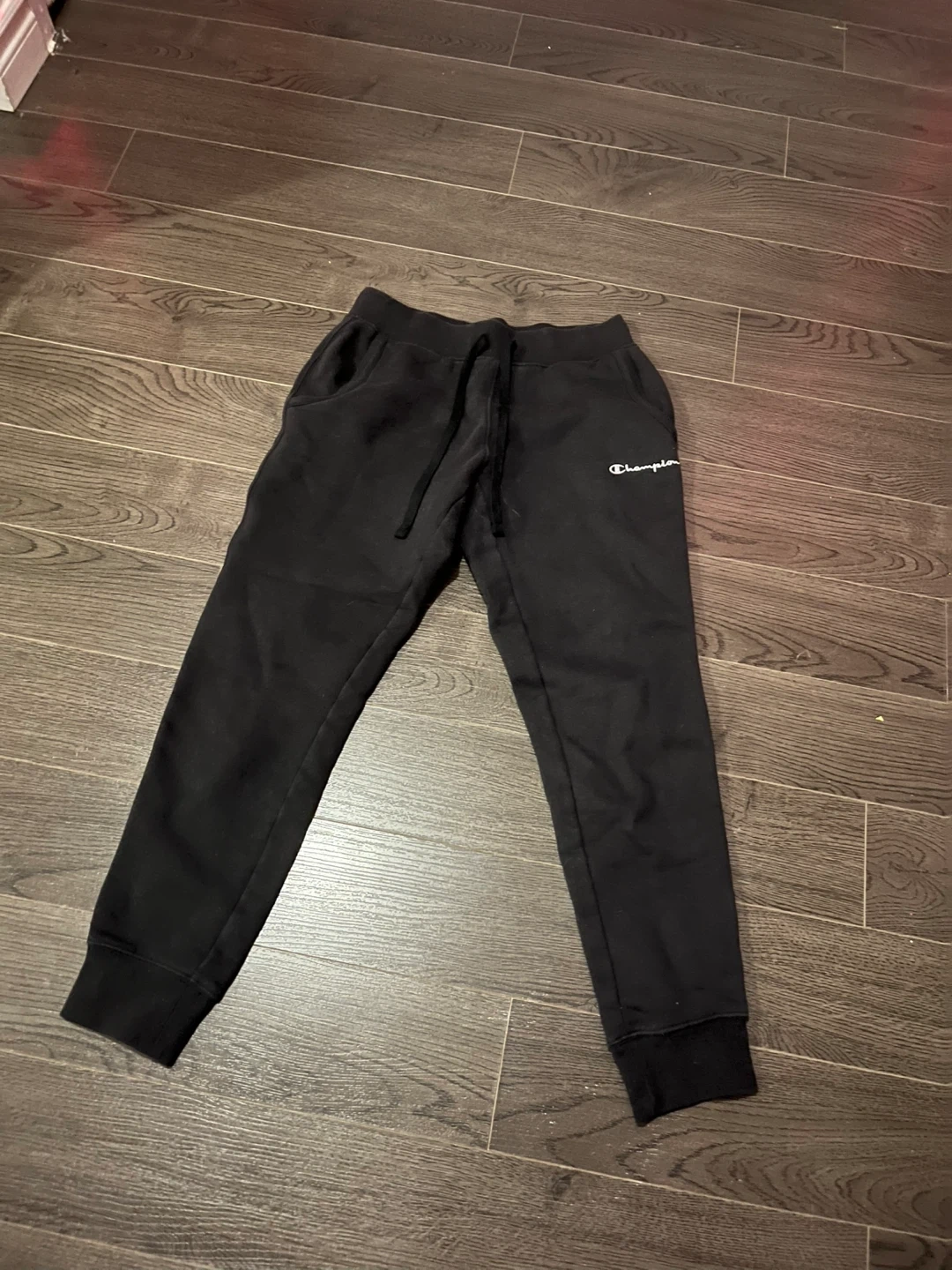 Selling a pair of Champion black joggers. They're in great condition and super comfy for lounging around or hitting the gym. The Champion logo is embroidered on the side. Perfect for everyday wear!
