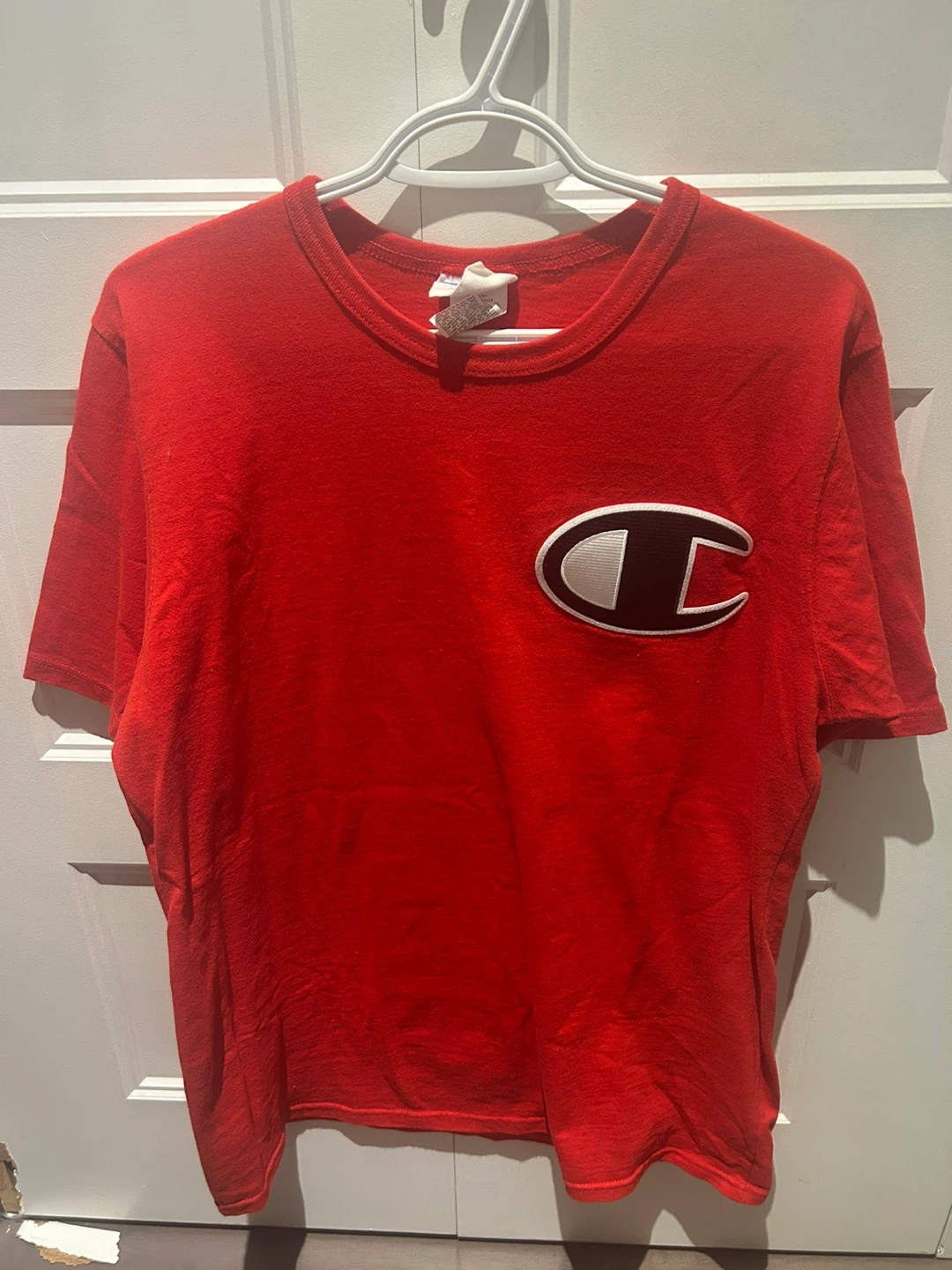 10Selling a red Champion t-shirt in size large. It has the classic Champion logo on the front. There is a small mark on the back of the shirt. Please see photos for details!