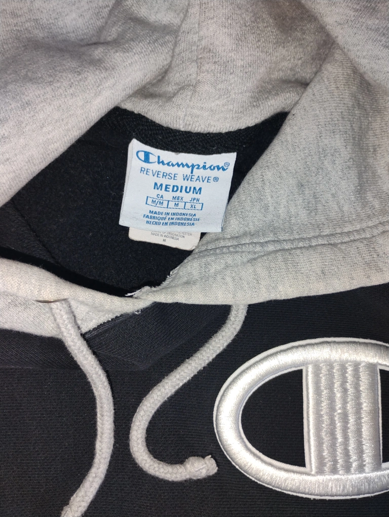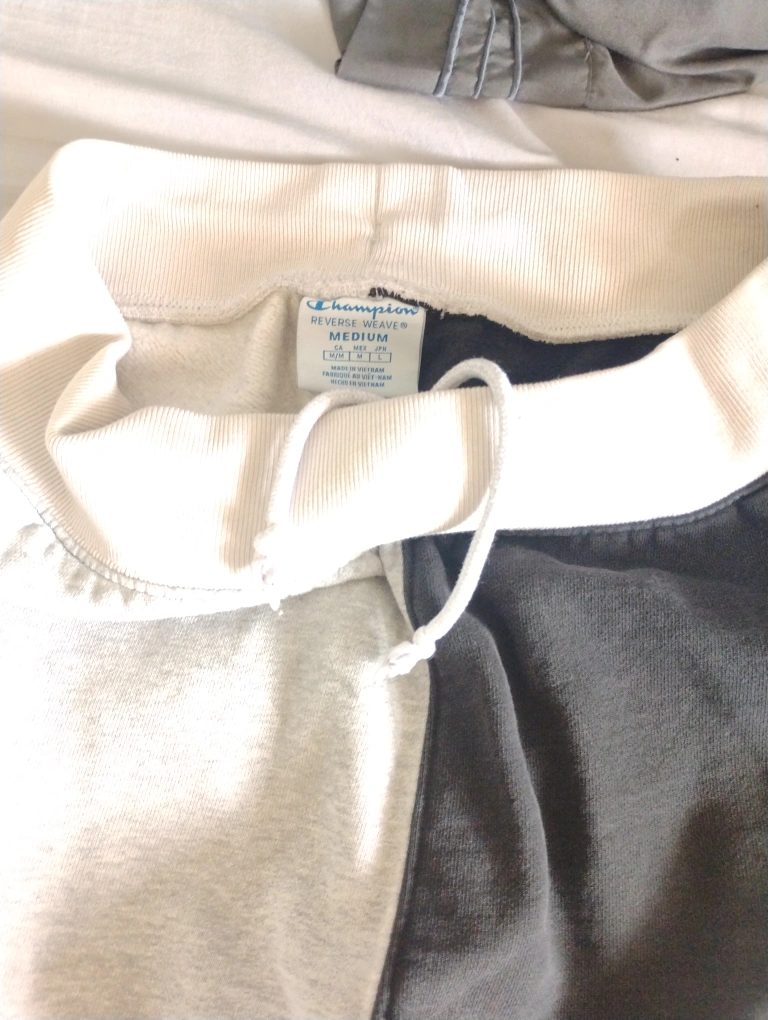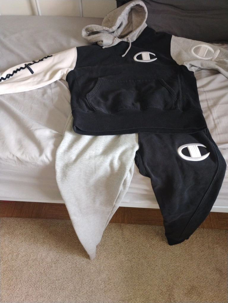 78Two-tone sweat set. Features a hoodie and sweatpants. Champion logo on both items. Great for lounging around on a lazy day.