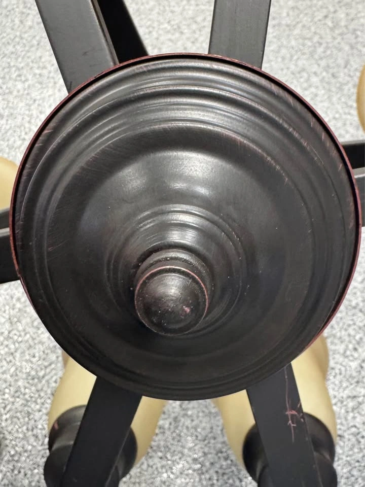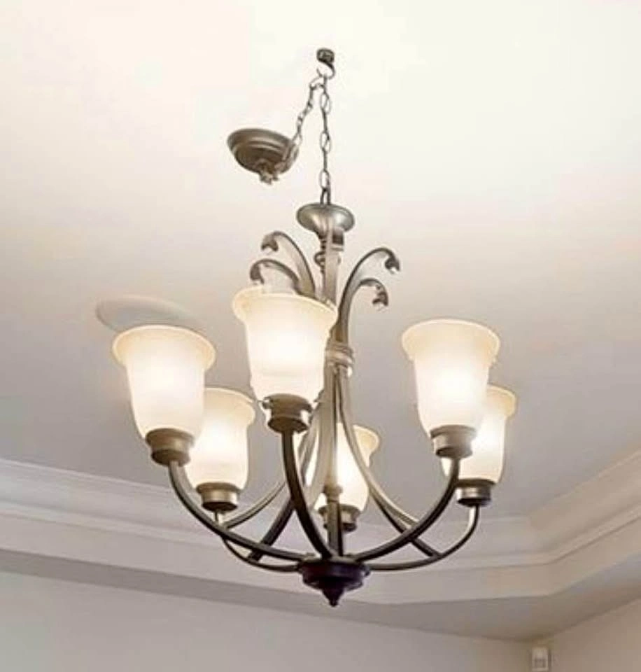 Stylish and functional chandelier with a dark metal frame and six frosted glass shades that give off a soft, warm glow. Its curved arms and classic design make it a perfect centerpiece for a dining room, kitchen, or foyer. The fixture hangs from a chain that can be adjusted to suit different ceiling heights. • Width: 26” • Height: 70” plus 19” chain • Six frosted glass bell shades • Timeless dark metal finish • In good condition and ready to install A versatile light fixture that blends well with both traditional and modern spaces. PICKUP ONLY