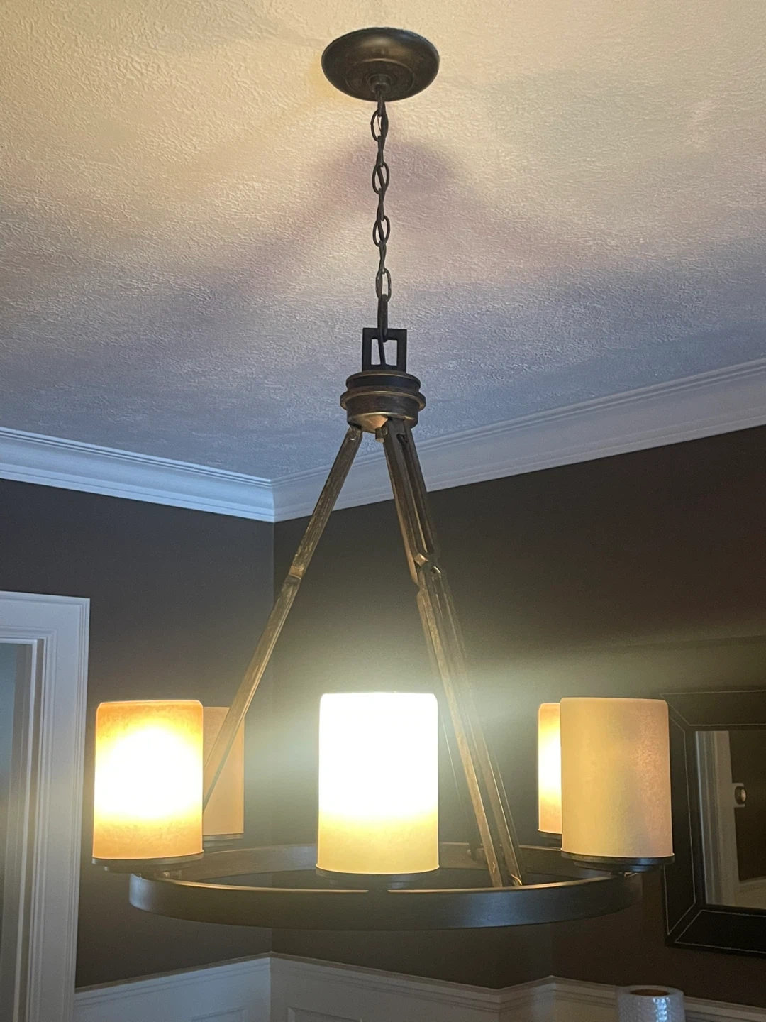 109Selling a chandelier with 5 lights. It's in great condition and would be a beautiful addition to any room! The design is simple yet elegant, and it provides ample lighting