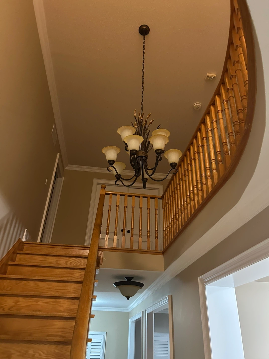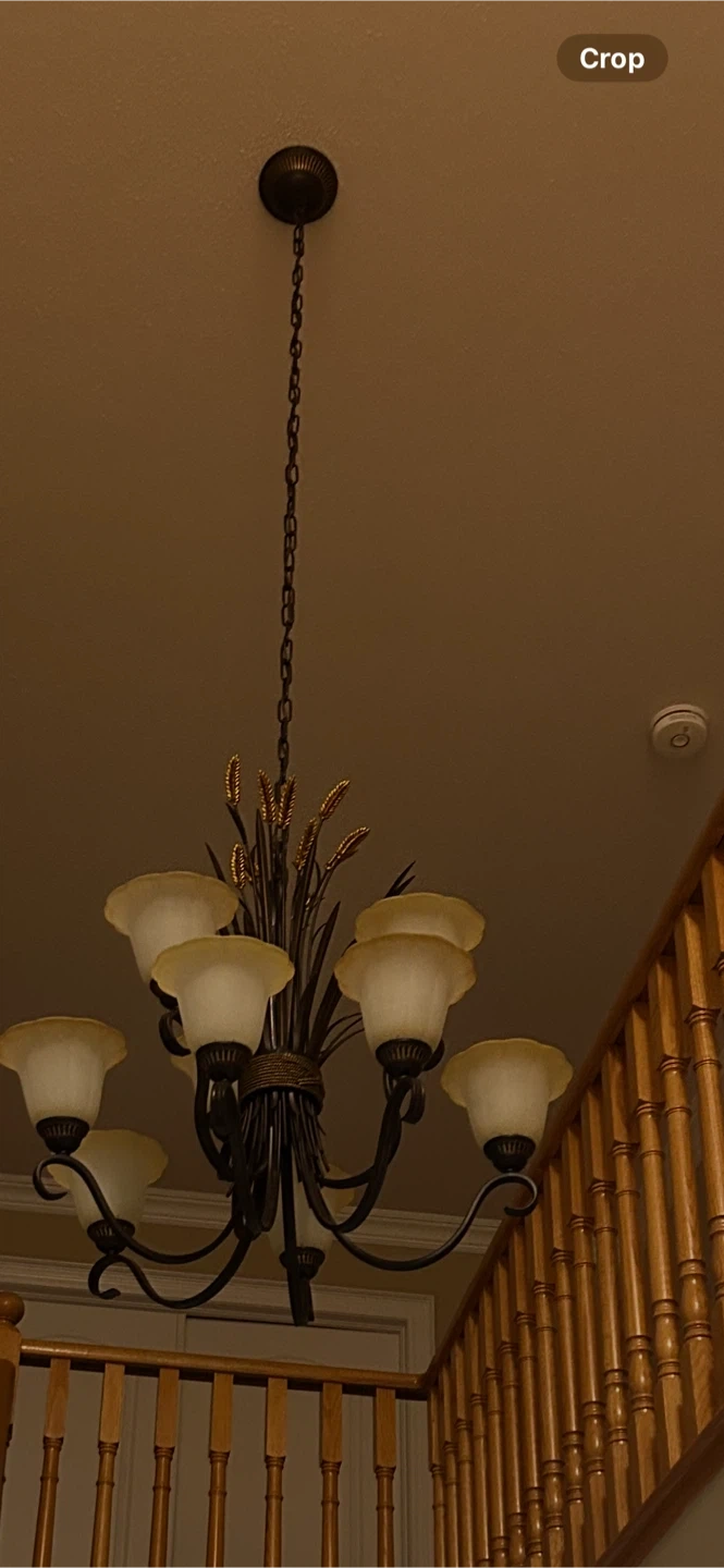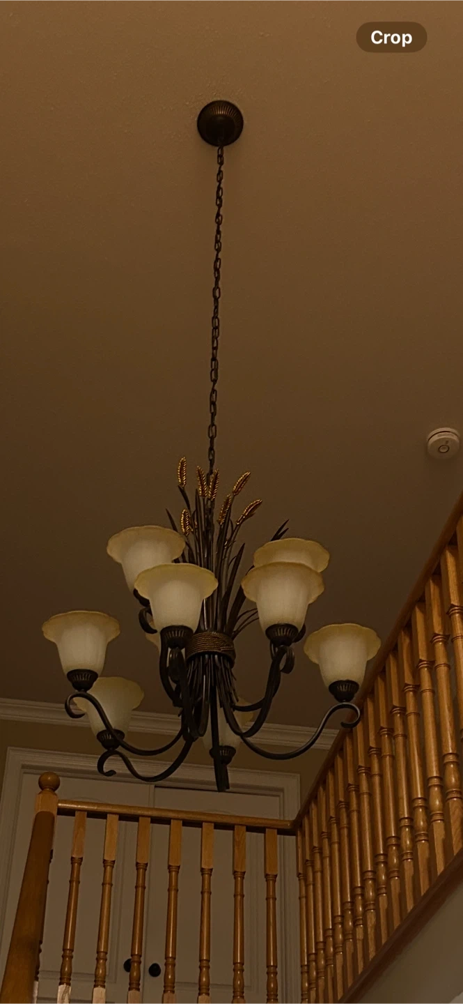10Elegant chandelier with a wheat stalk design feature. It has 9 lights with tulip shaped shades. Would be a great addition to any dining room or entryway!