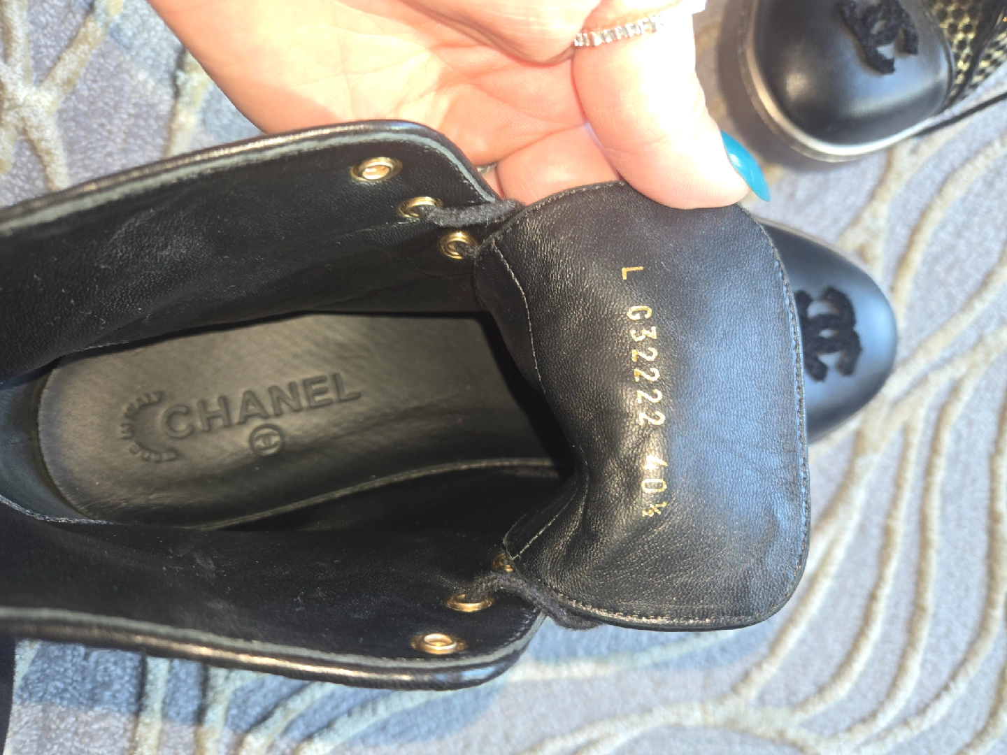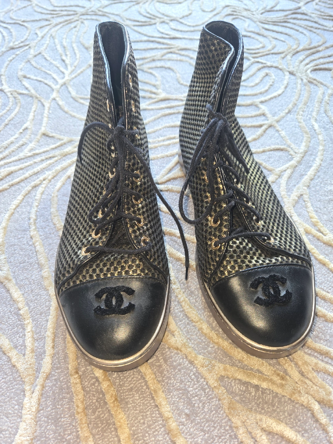 Selling a pair of Chanel high-top sneakers! They're a size 40.5. The sneakers feature a stylish black and gold design. Perfect for adding a touch of luxury to your everyday look