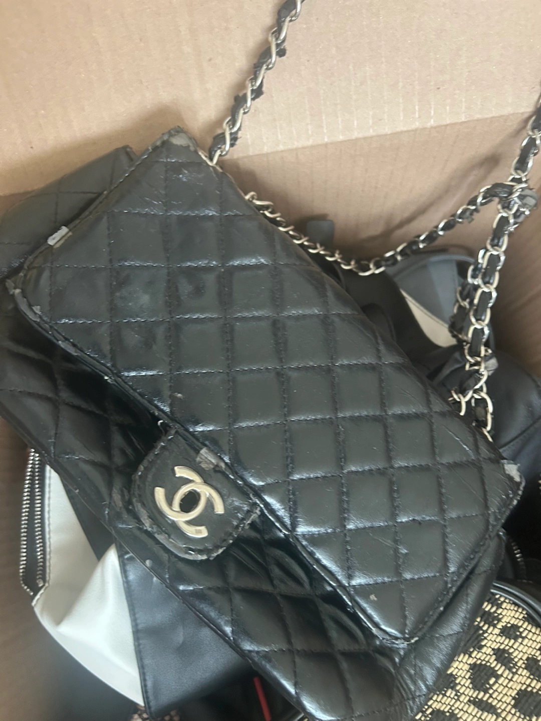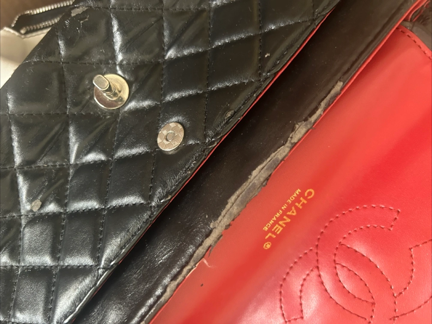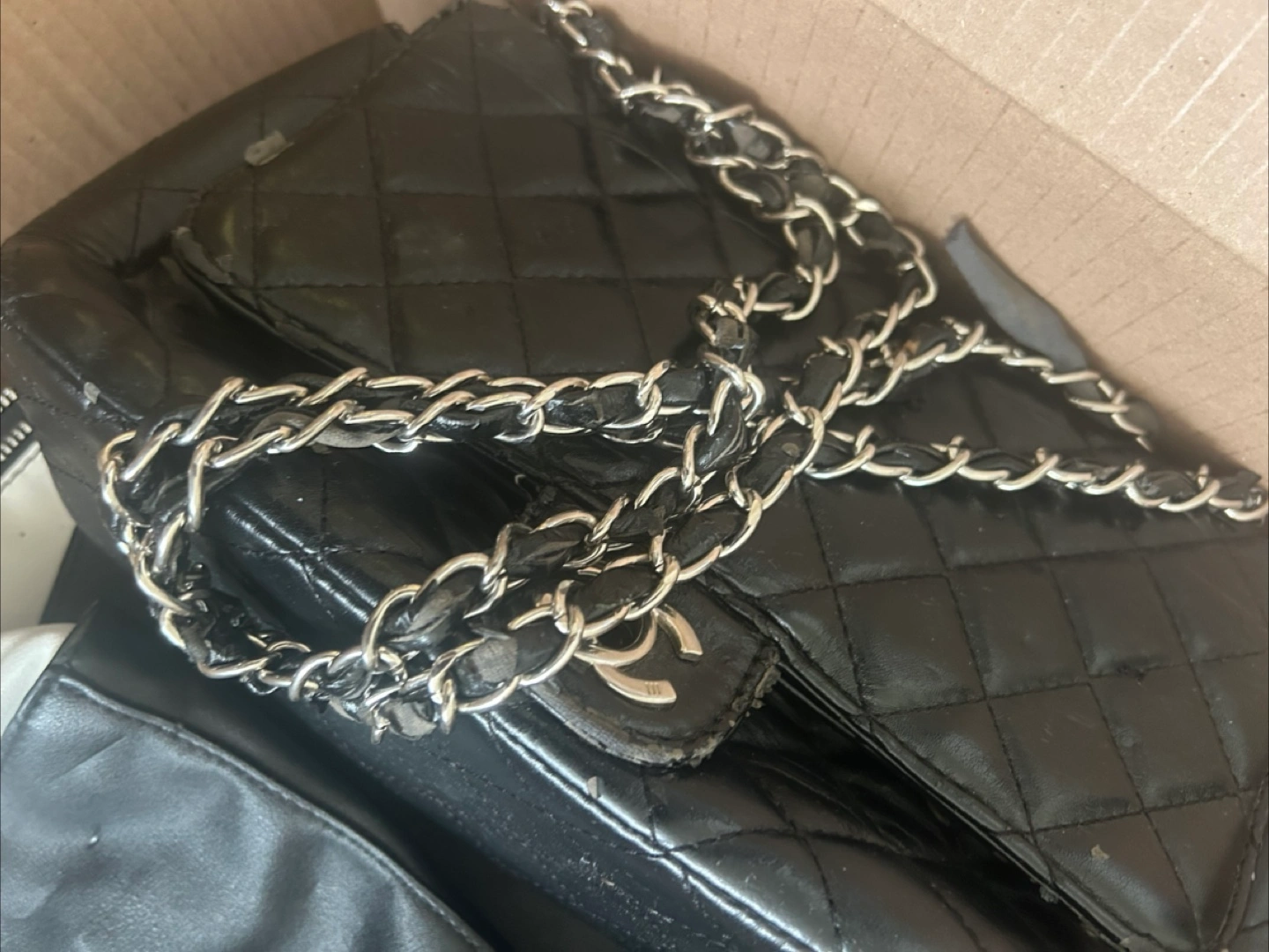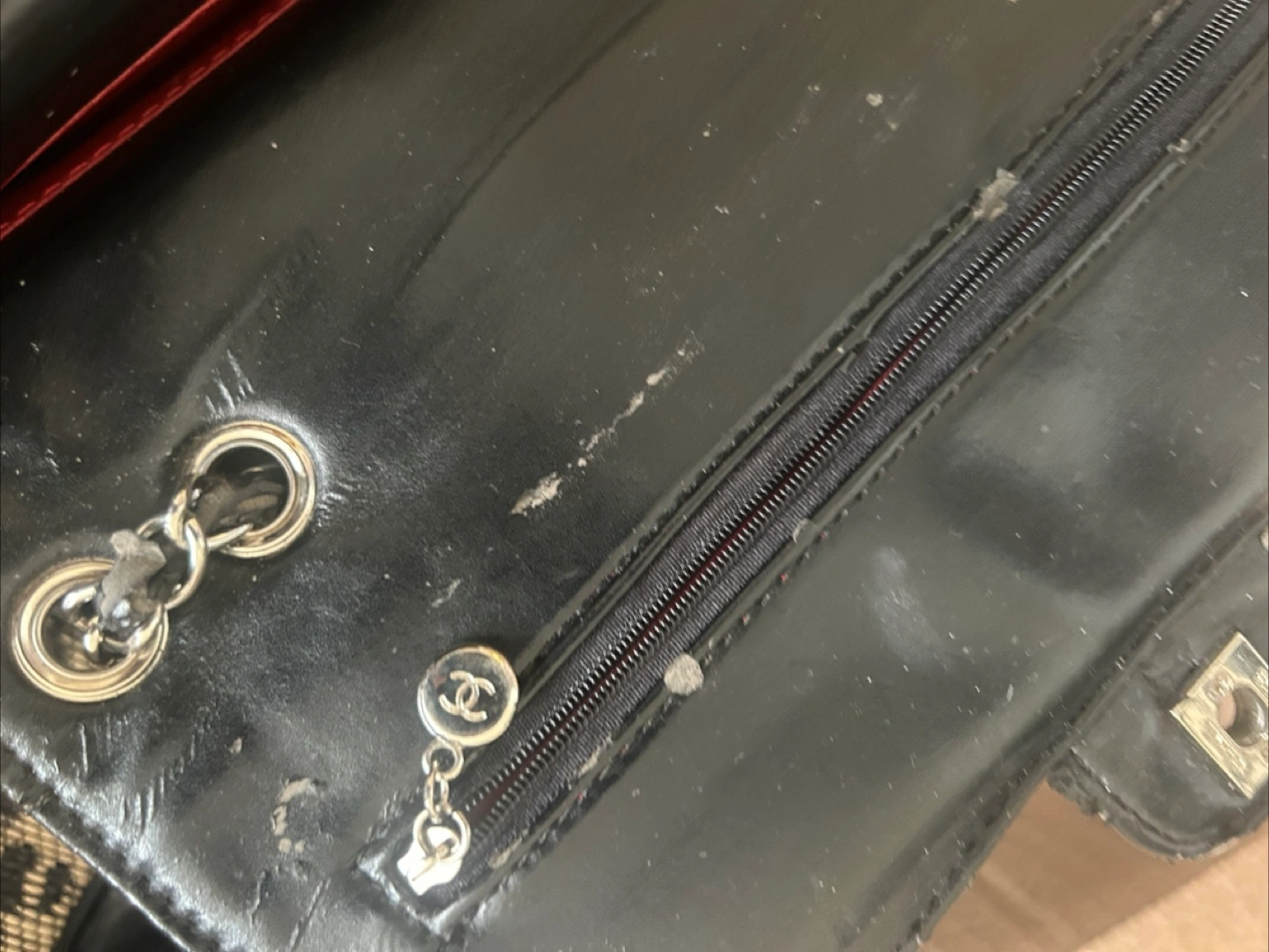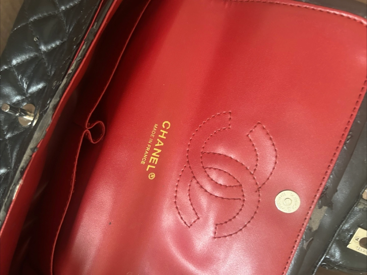 21Selling a Chanel quilted leather handbag. It's black with a silver chain. The interior is a vibrant red.