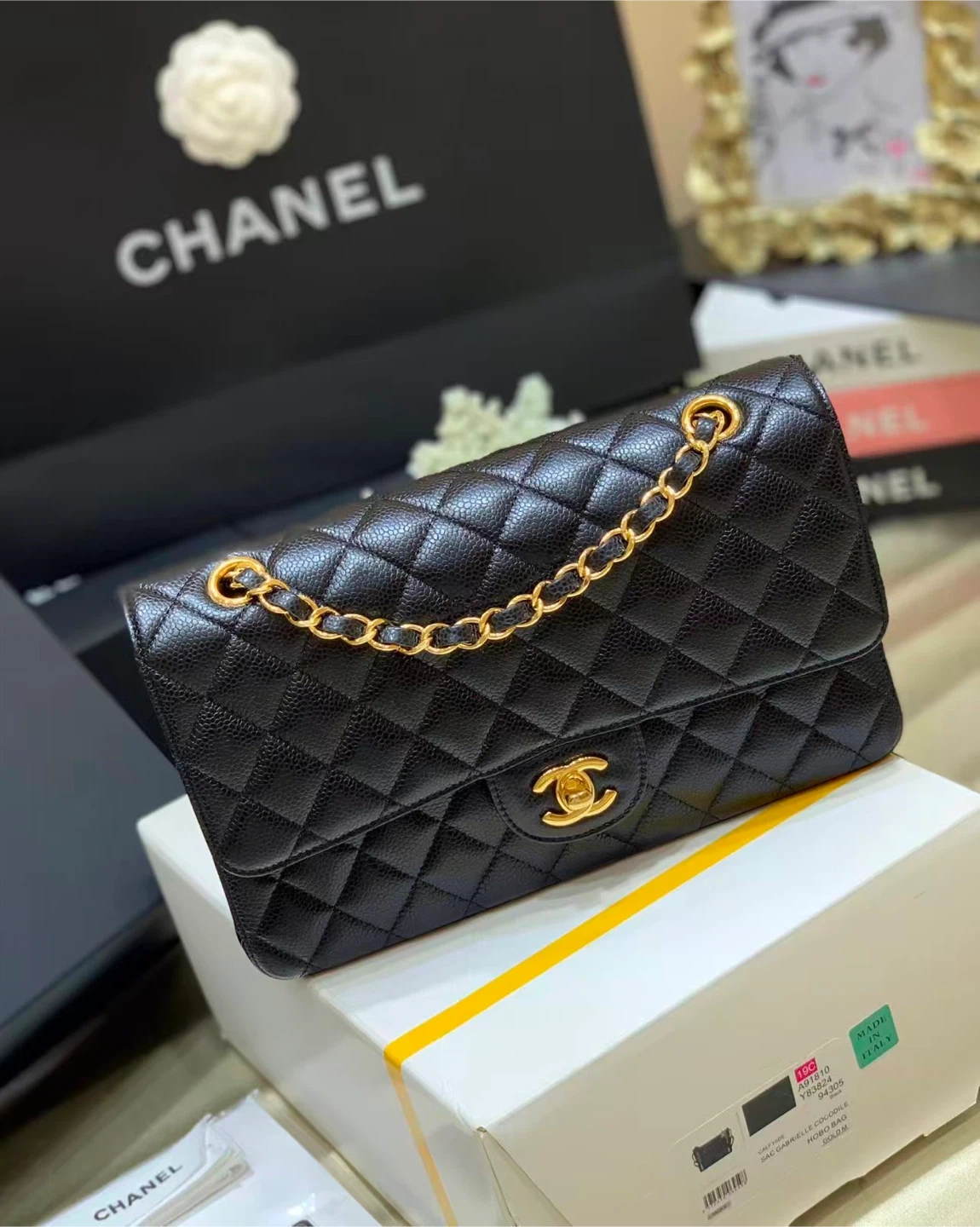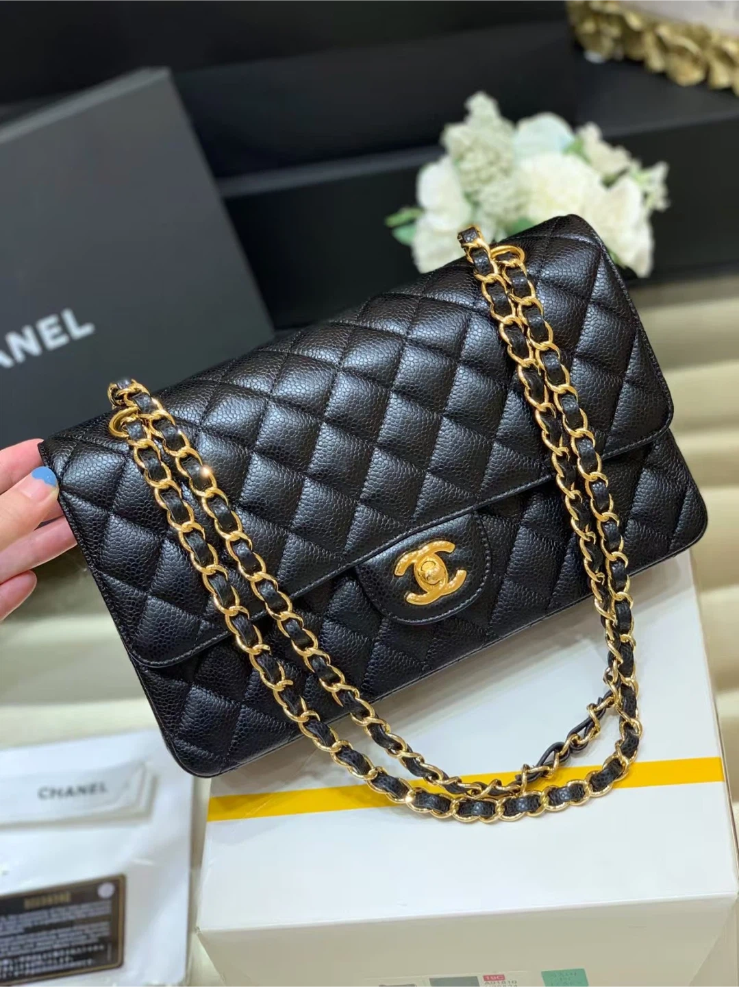 224Selling a beautiful Chanel Classic Flap Bag in black. It's in great condition and comes with the box. The bag features the iconic quilted design and gold chain. A timeless piece to add to your collection!