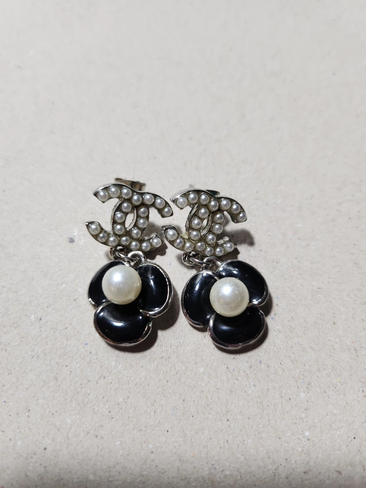 These are a pair of Chanel flower drop earrings. They feature the iconic Chanel logo adorned with pearls, and a black flower design with a pearl drop. A stylish addition to any outfit!