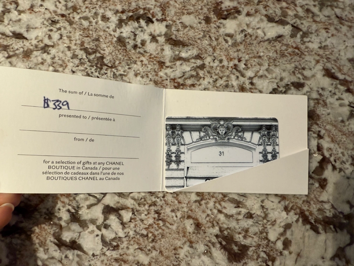 27Chanel gift card. Valid at any Canadian Chanel boutique. $339 value.