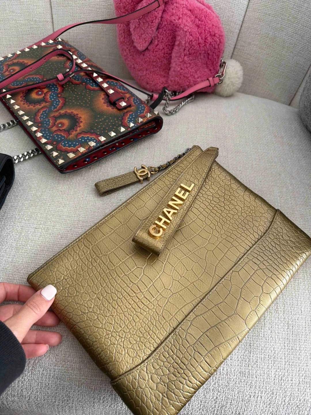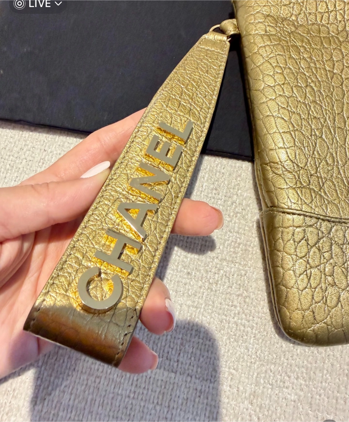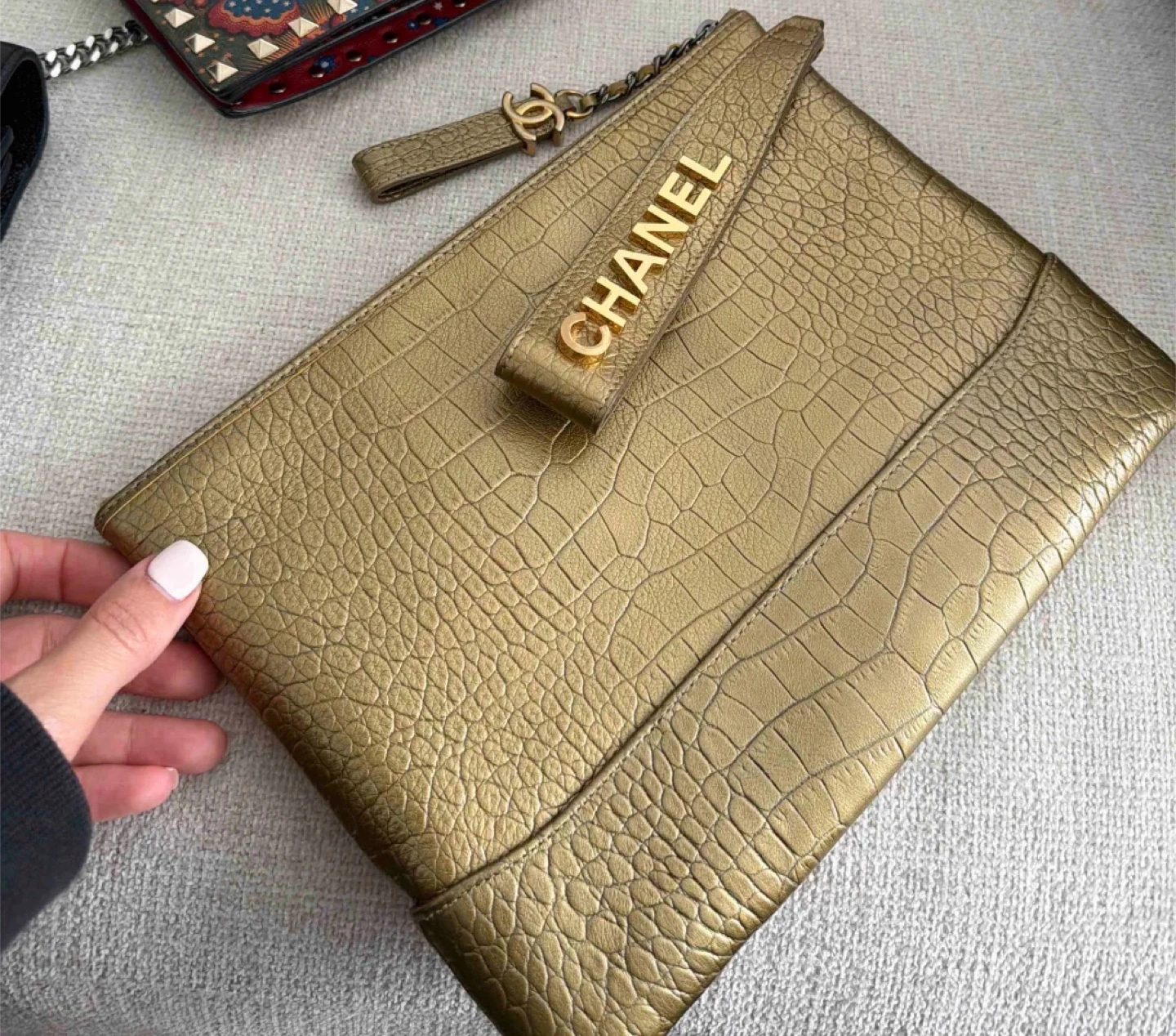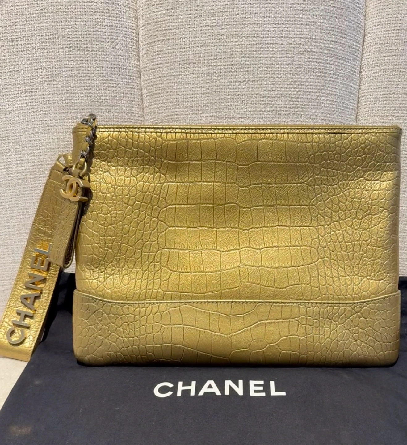 Selling a beautiful Chanel gold clutch. It features a unique crocodile-like texture and the Chanel logo on the strap. Perfect for adding a touch of luxury to any outfit! Authentic. Please find the record of payment. Purchased in yorkdale. This is only one sold in Toronto. You can not find the second inGTA