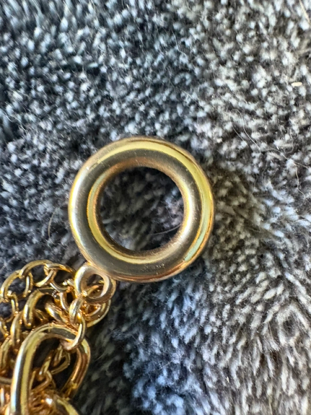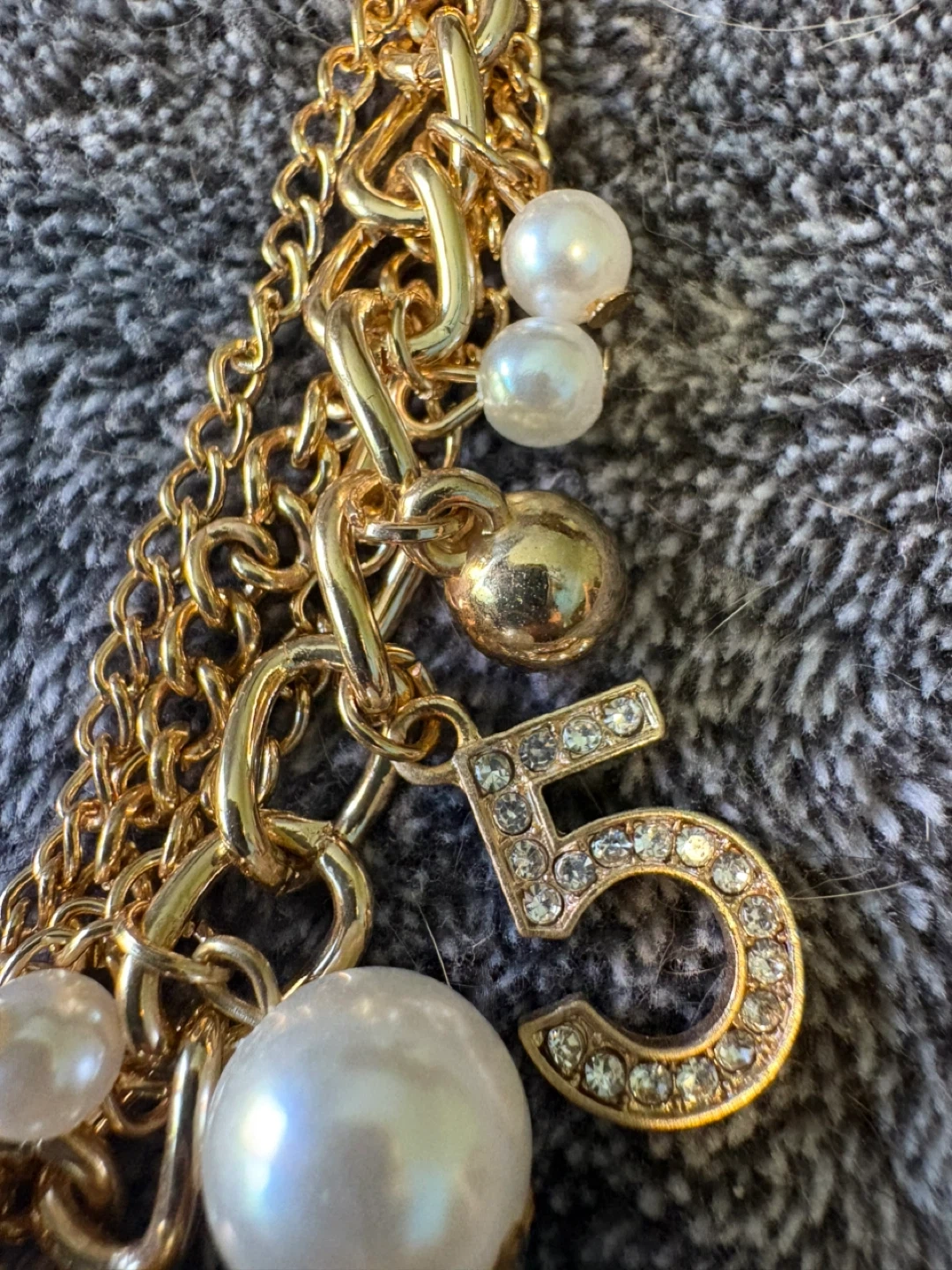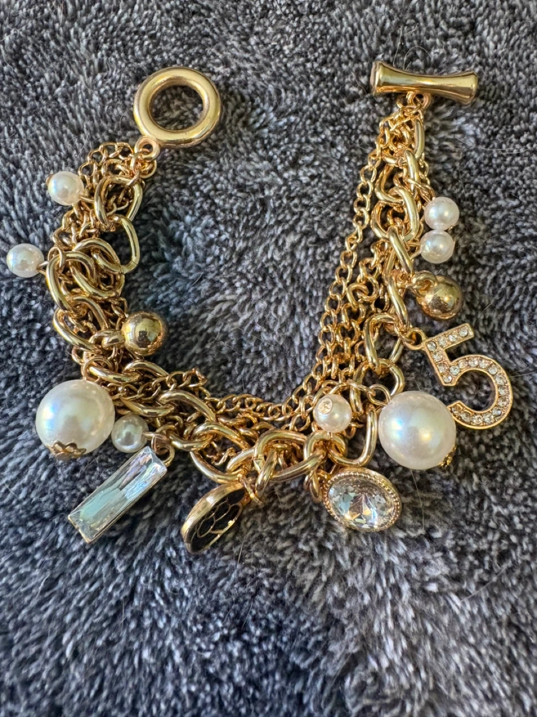 Selling a gold tone charm bracelet! It features a variety of charms, including pearls and a rhinestone number 5. It's a stylish piece to add to your jewelry collection