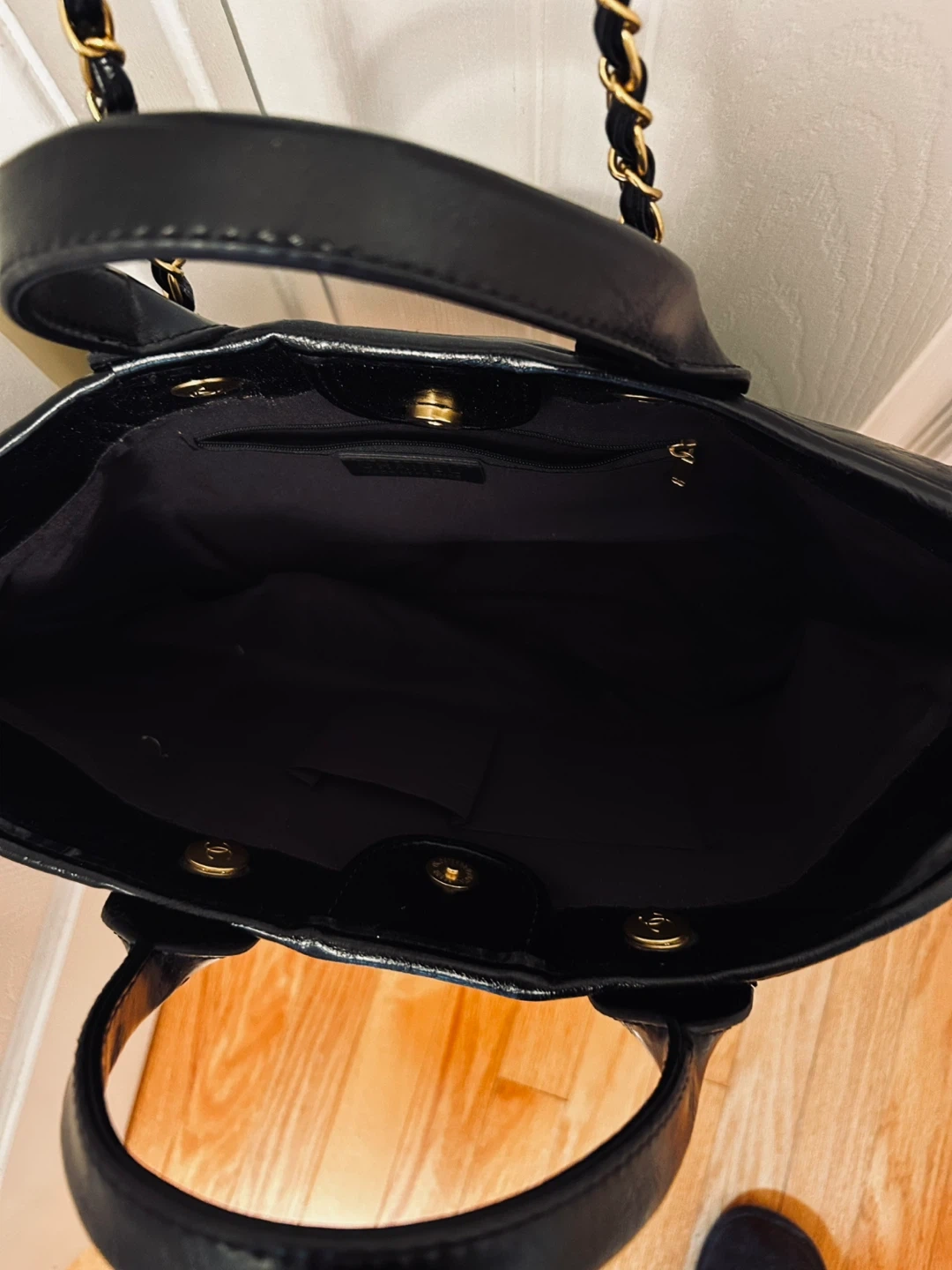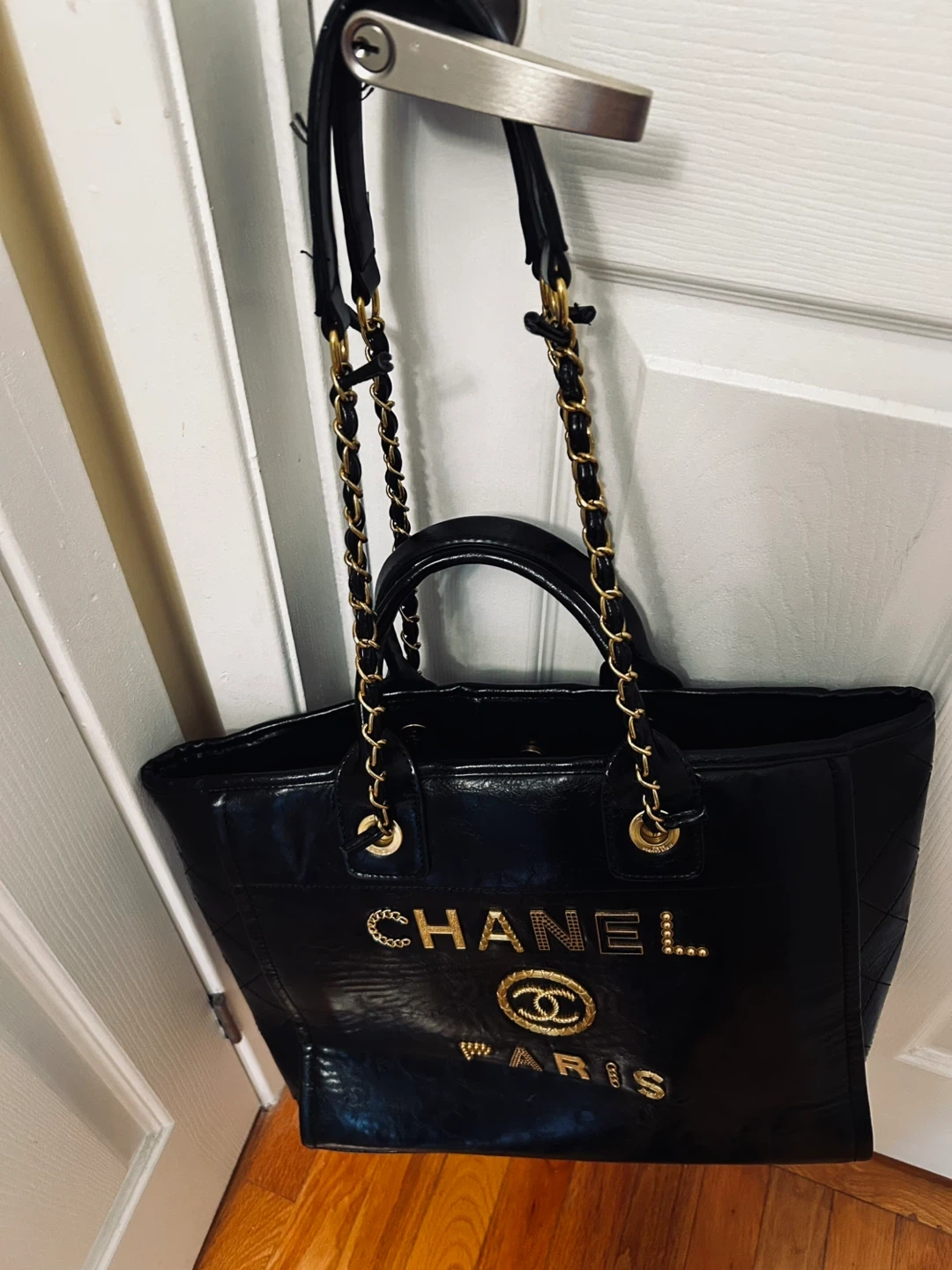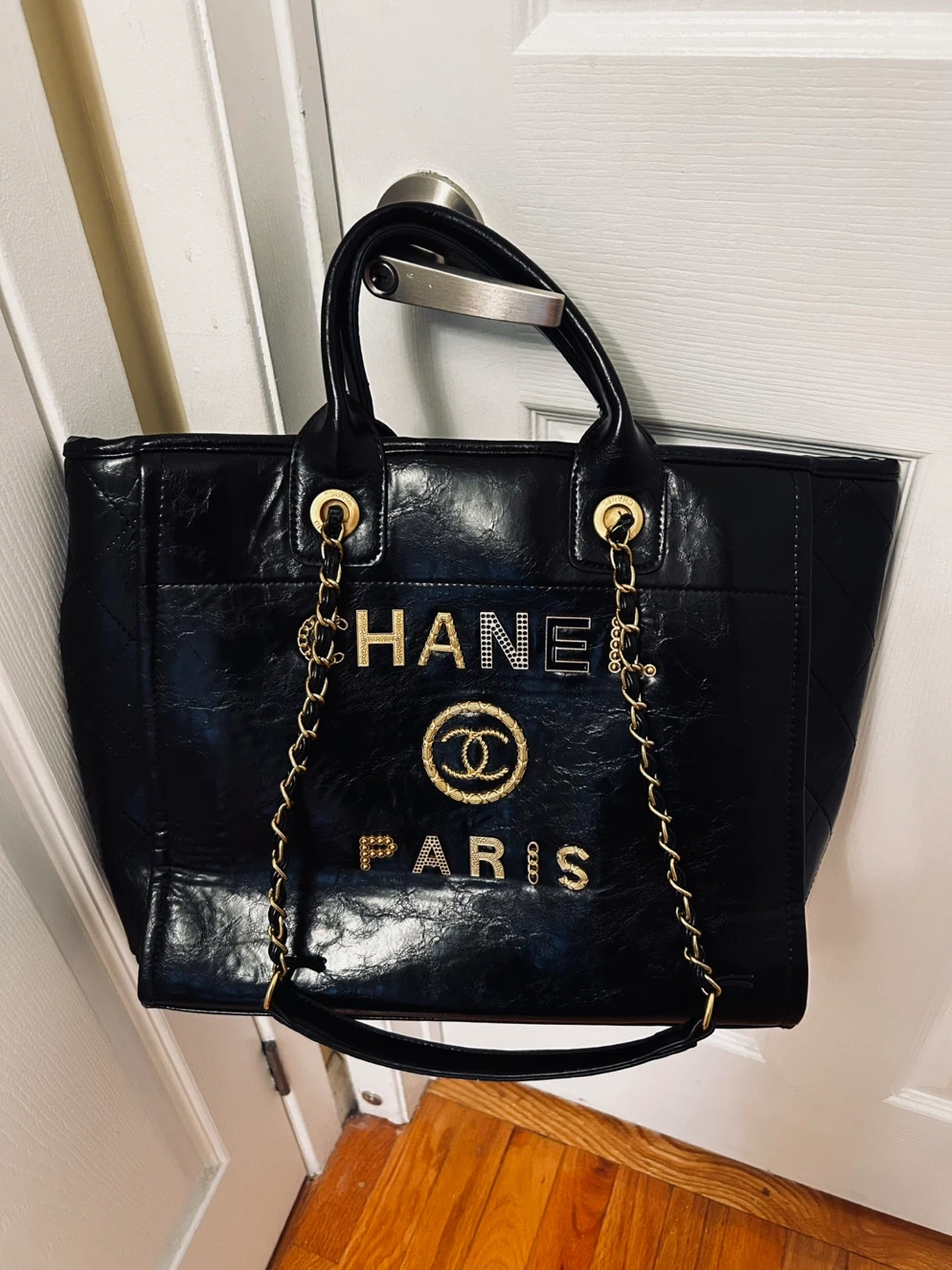 Selling a stylish Chanel Paris tote bag in black! It features gold detailing and chain straps. Perfect for everyday use and adding a touch of luxury to your outfit Not Authentic