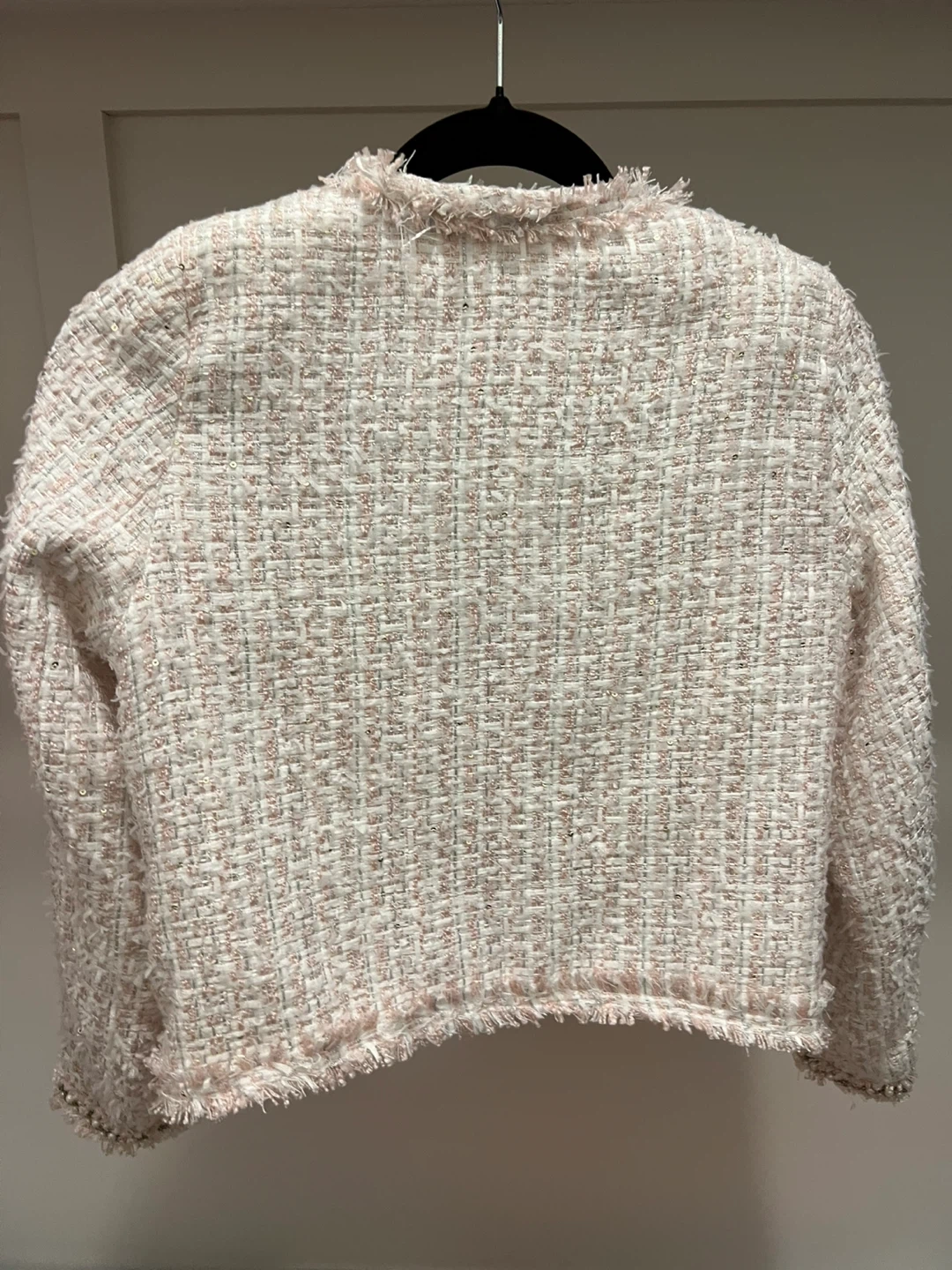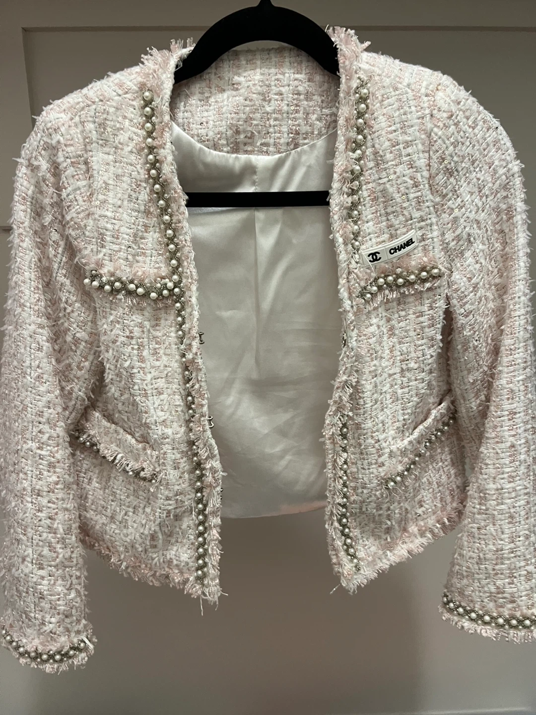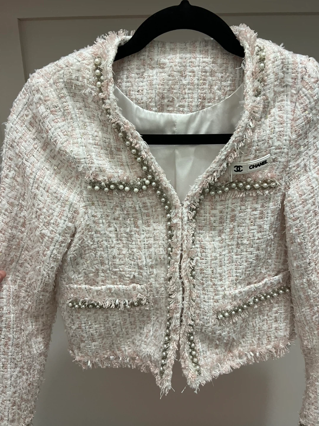 83Selling a lovely Chanel tweed jacket! It features beautiful pearl detailing around the collar and pockets. It's a stylish piece that would make a great addition to any wardrobe