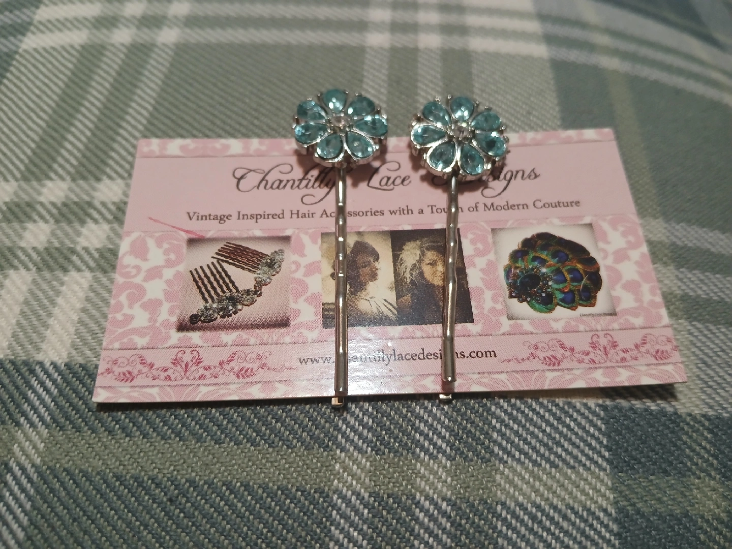 31These are a pair of vintage-inspired hair accessories from Chantilly Lace Designs. They feature a delicate floral design with a touch of modern couture. Perfect for adding a unique touch to your hairstyle!