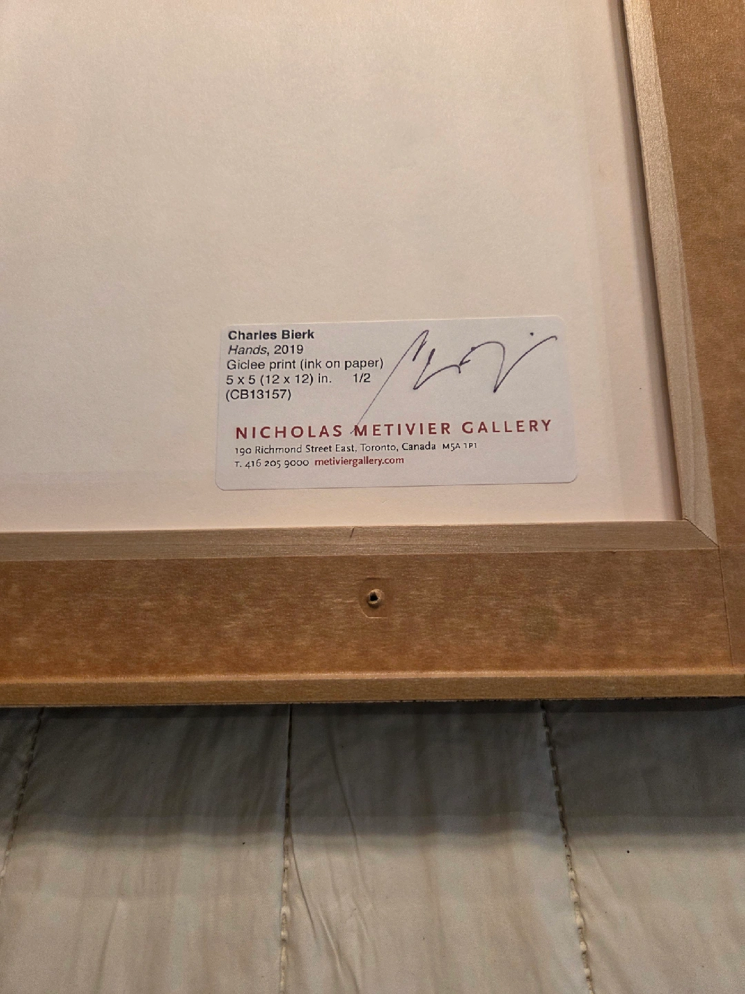 Selling a framed print by Charles Bierk titled 'Hands, 2019'. It's a giclee print (ink on paper) with dimensions of 5 x 5 (12 x 12) inches. It comes from Nicholas Metivier Gallery