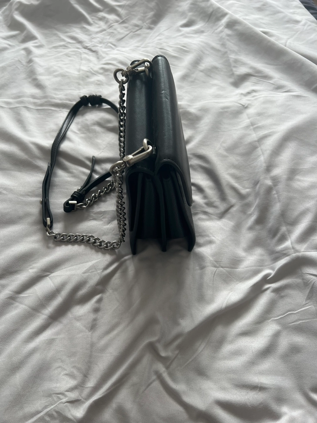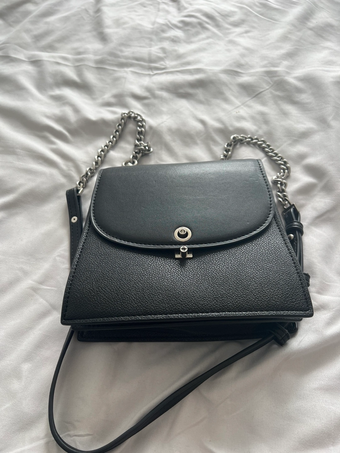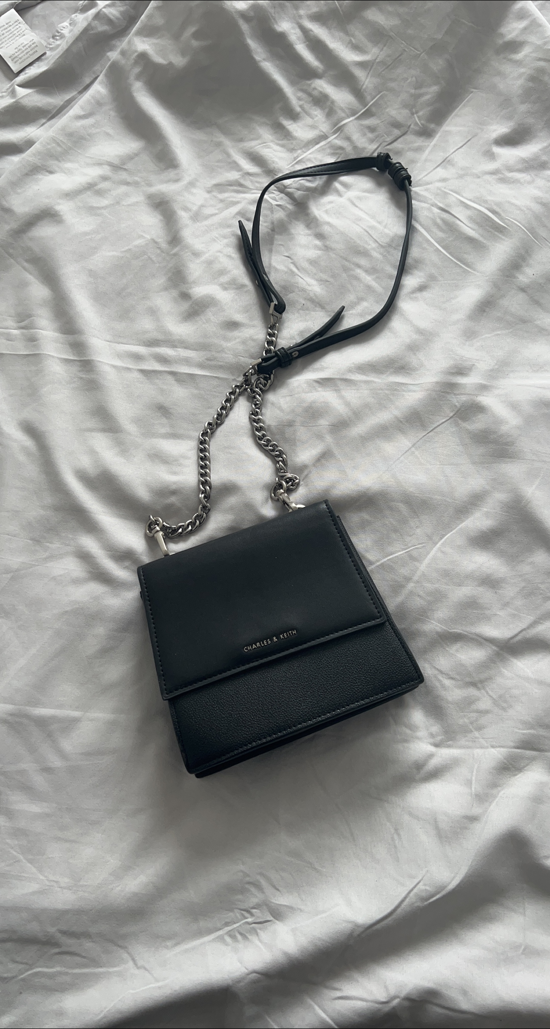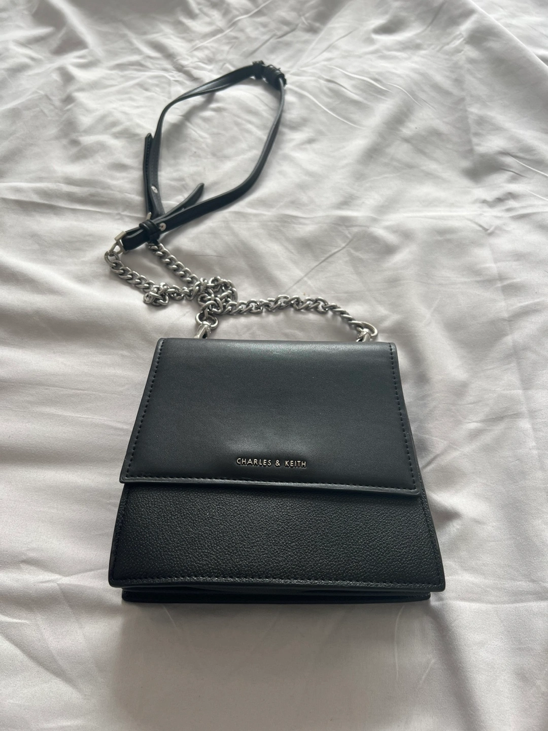 18Selling a cute black Charles & Keith bag with a chain strap! It's practical for going out or everyday use. The bag features a flap closure and has a sleek, minimalist design. Back closure broken. Cash only