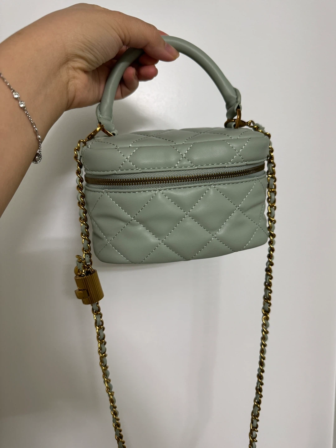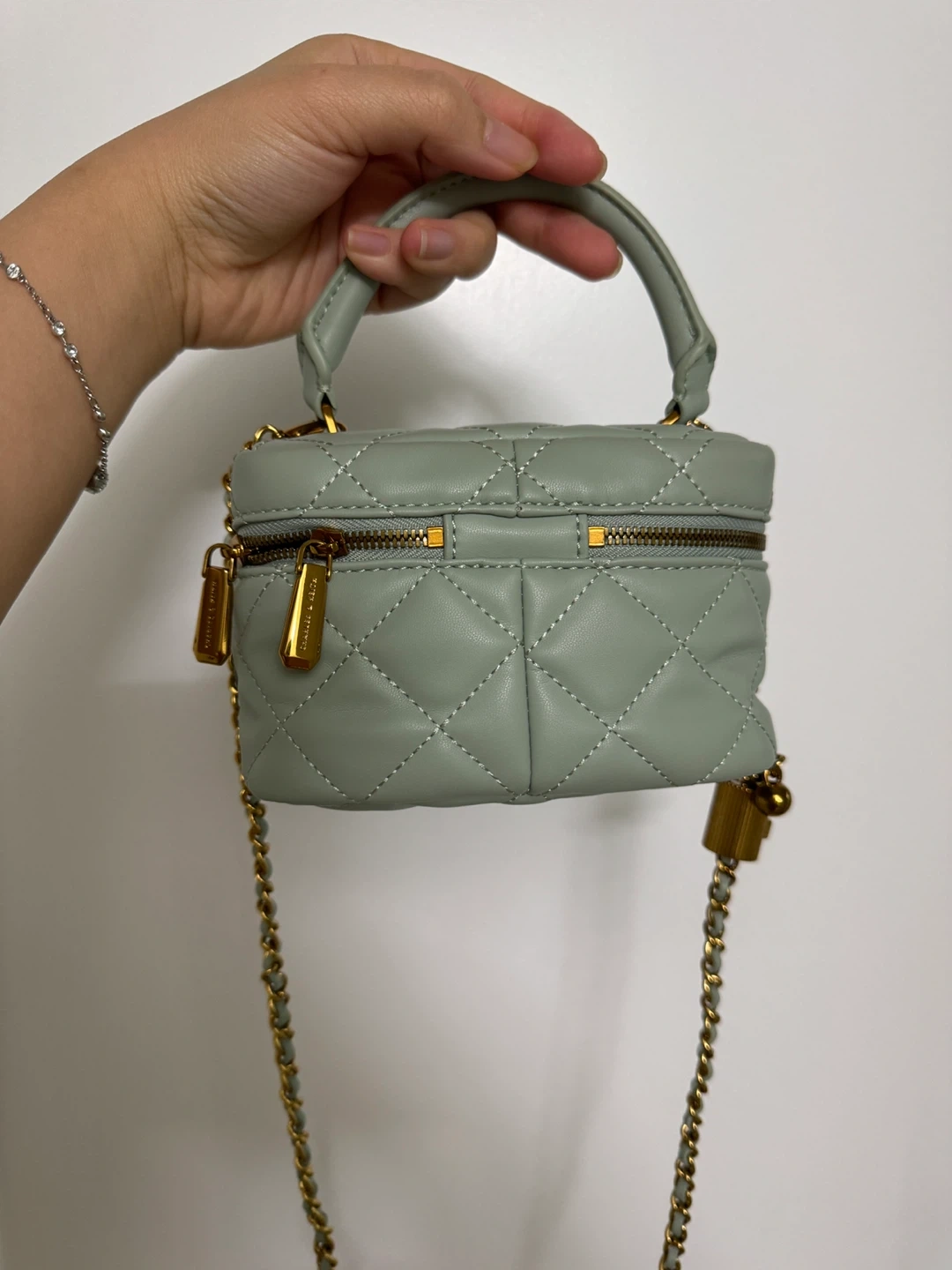 10This is a super cute quilted vanity bag from Charles & Keith! It's a beautiful light green colour with a gold chain detail. Perfect for adding a touch of elegance to any outfit!