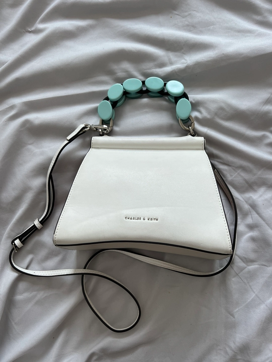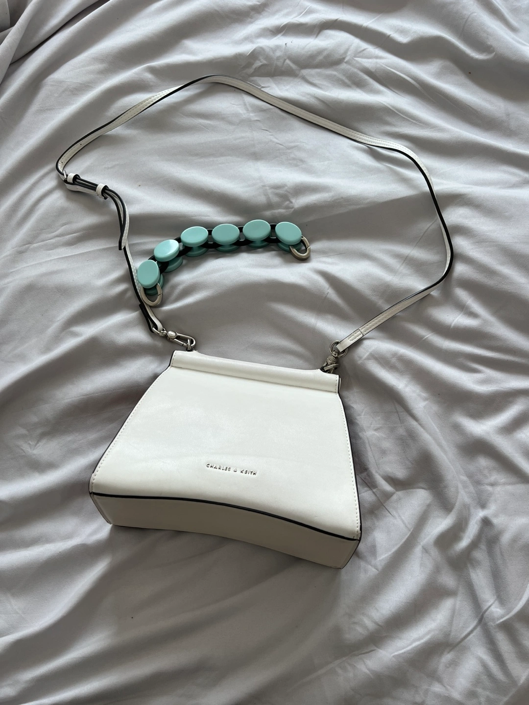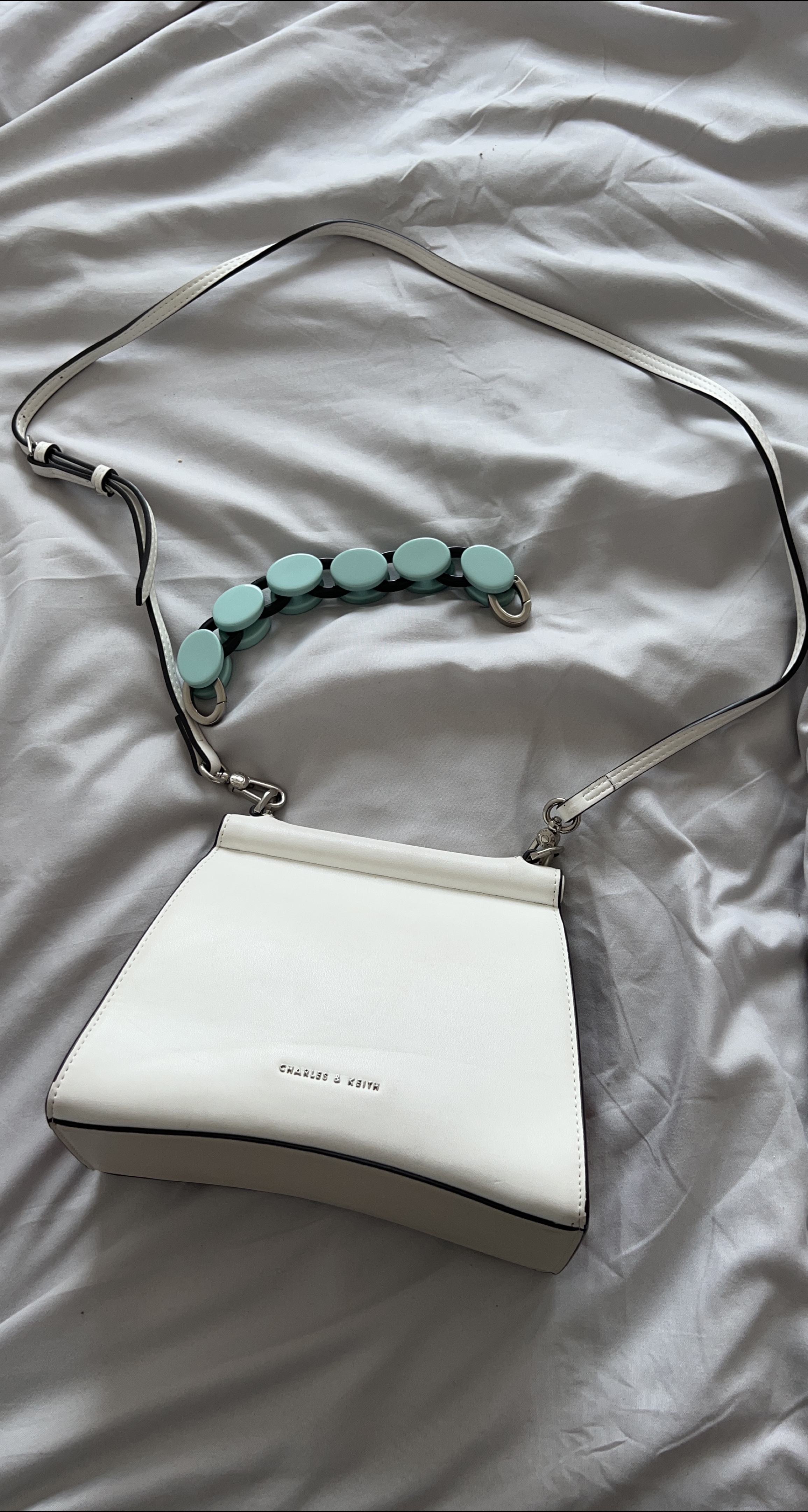 18A stylish white shoulder bag from Charles & Keith! It's in great condition and ready for a new home. The bag features a unique design with a detachable handle with blue accents. Perfect for adding a touch of elegance to any outfit. Cash only