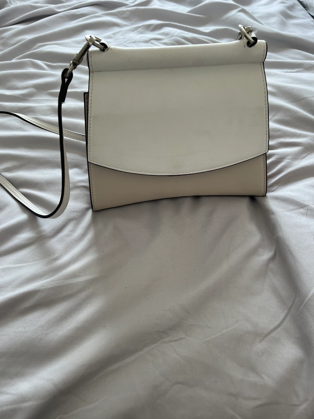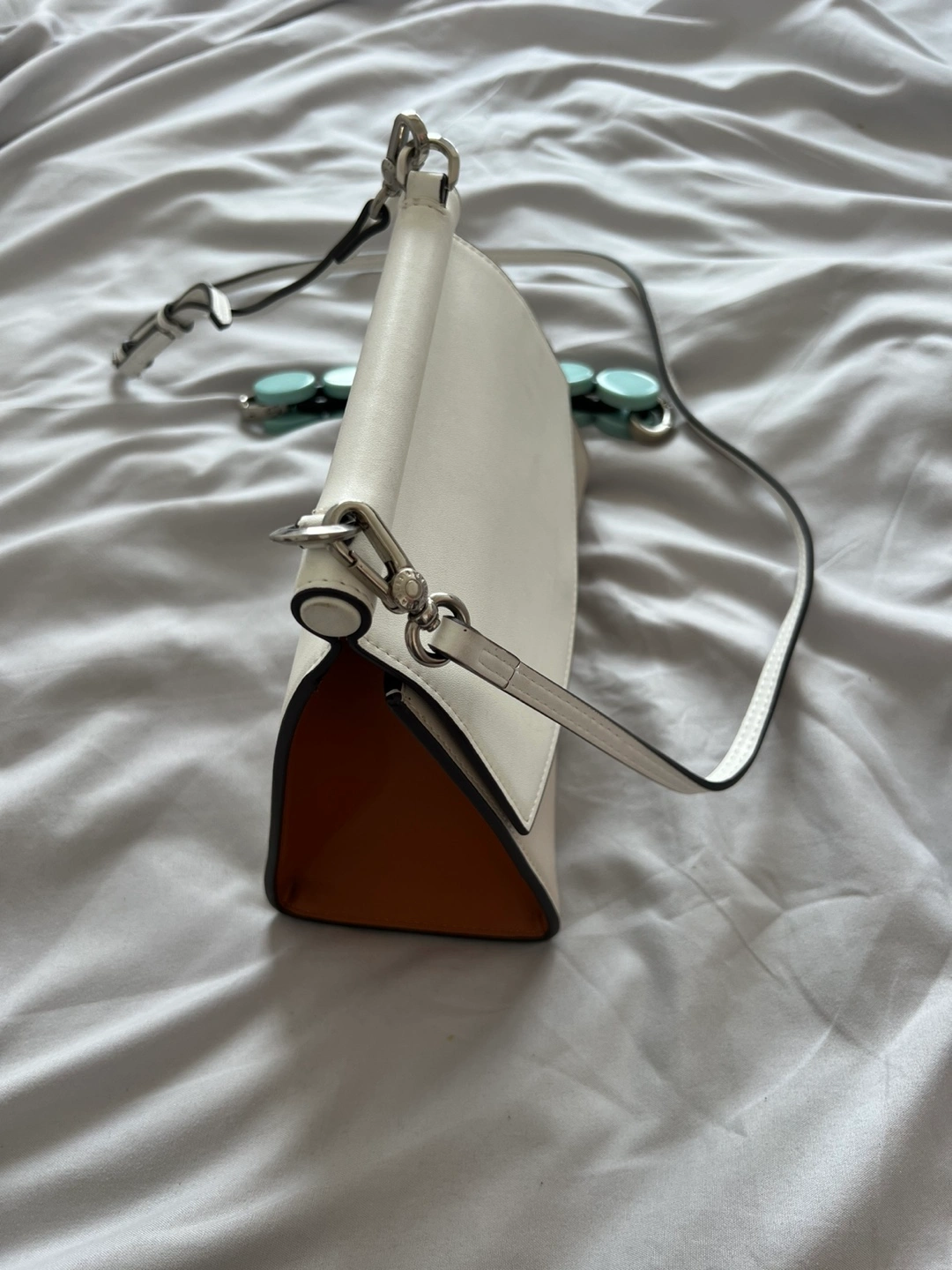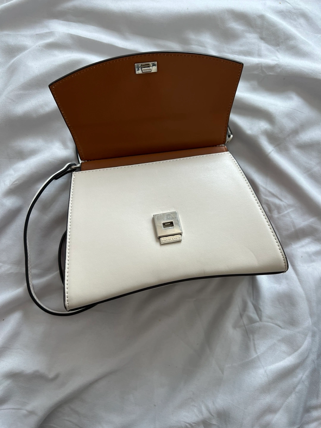 18A stylish white shoulder bag from Charles & Keith! It's in great condition and ready for a new home. The bag features a unique design with a detachable handle with blue accents. Perfect for adding a touch of elegance to any outfit. Cash only