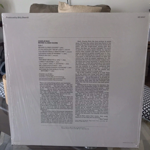 184Charlie Rich ~ "Behind Closed Doors" Record Album Cover and Vinyl VG++++ "Behind Closed Doors" is a 1973 album by Charlie Rich. The album received the Country Music Association award for Album of the Year; the title track (written by Kenny O'Dell) was also named CMA's Single of the Year, and Rich was named Best Male Vocalist for his performance on the album. Rich won the 1974 Grammy for Best Country Vocal Performance Male and also took home four Academy of Country Music awards for this album. In 2006, CMT ranked "Behind Closed Doors" No. 37 on its list of the 40 greatest albums in country music. In 2002, the album was certified Quadruple Platinum by the RIAA, commemorating U.S. sales of over four million. Charlie Rich contributed "Peace On You" to this album. Charlie's wife Margaret Ann contributed two of her songs to the album as well, "A Sunday Kind of Woman" and "Nothing In The World (To Do With Me)". Charlie's teenage son contributed the song "You Never Really Wanted Me" to the album as well. Niagara Falls pick-up