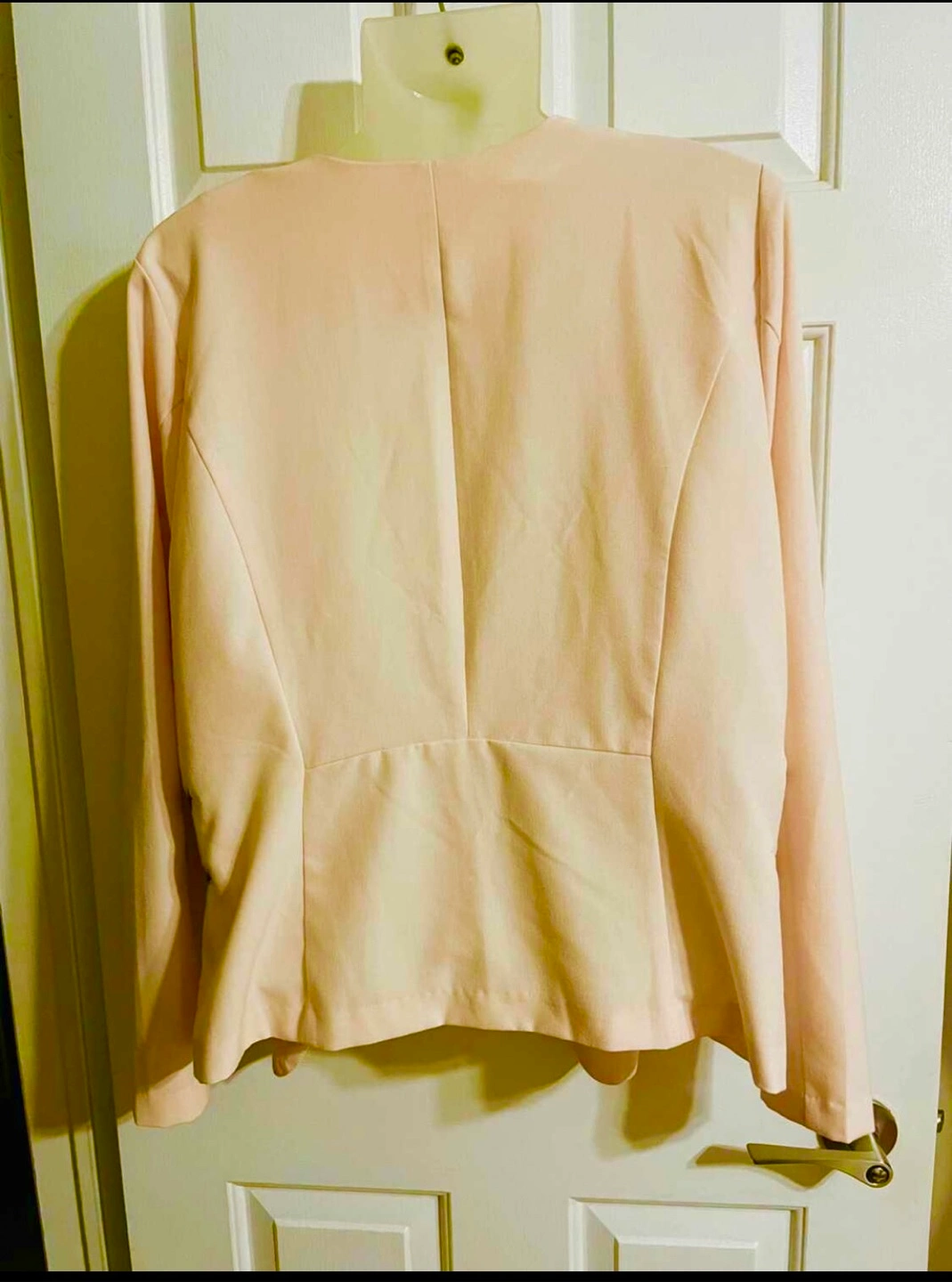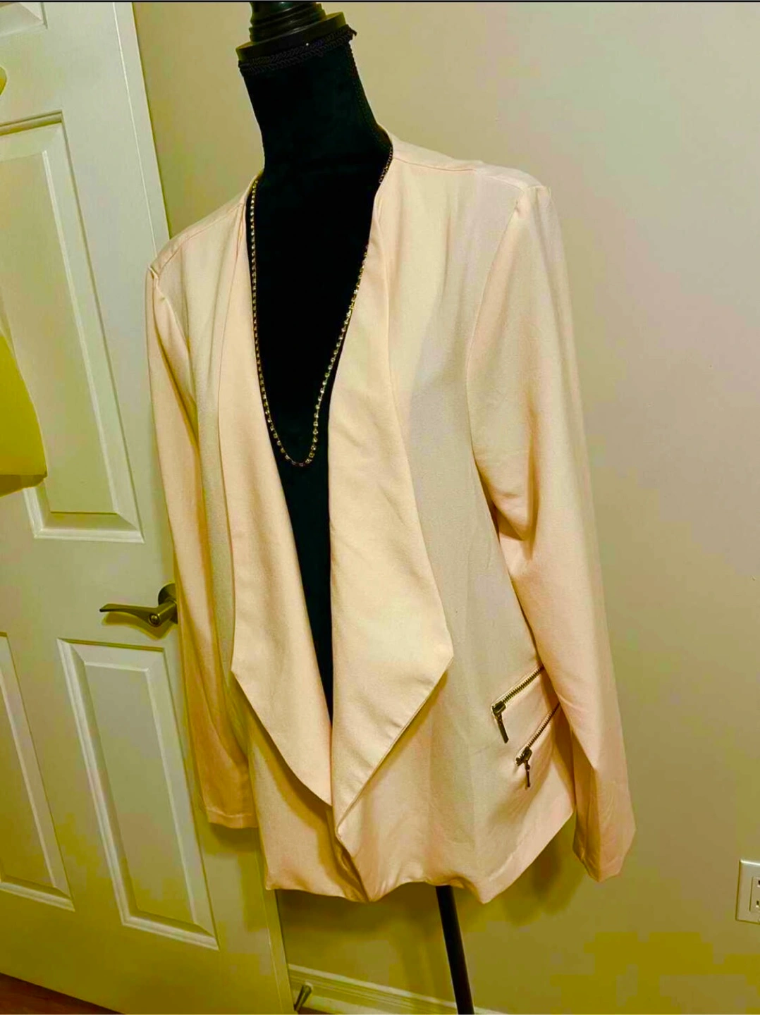 Selling a Charlotte Russe blazer. It's a lovely light pink colour and made of polyester, rayon, & spandex. Tag says 3X but fits more like a 2X in my opinion. Note the stylish zipper details!