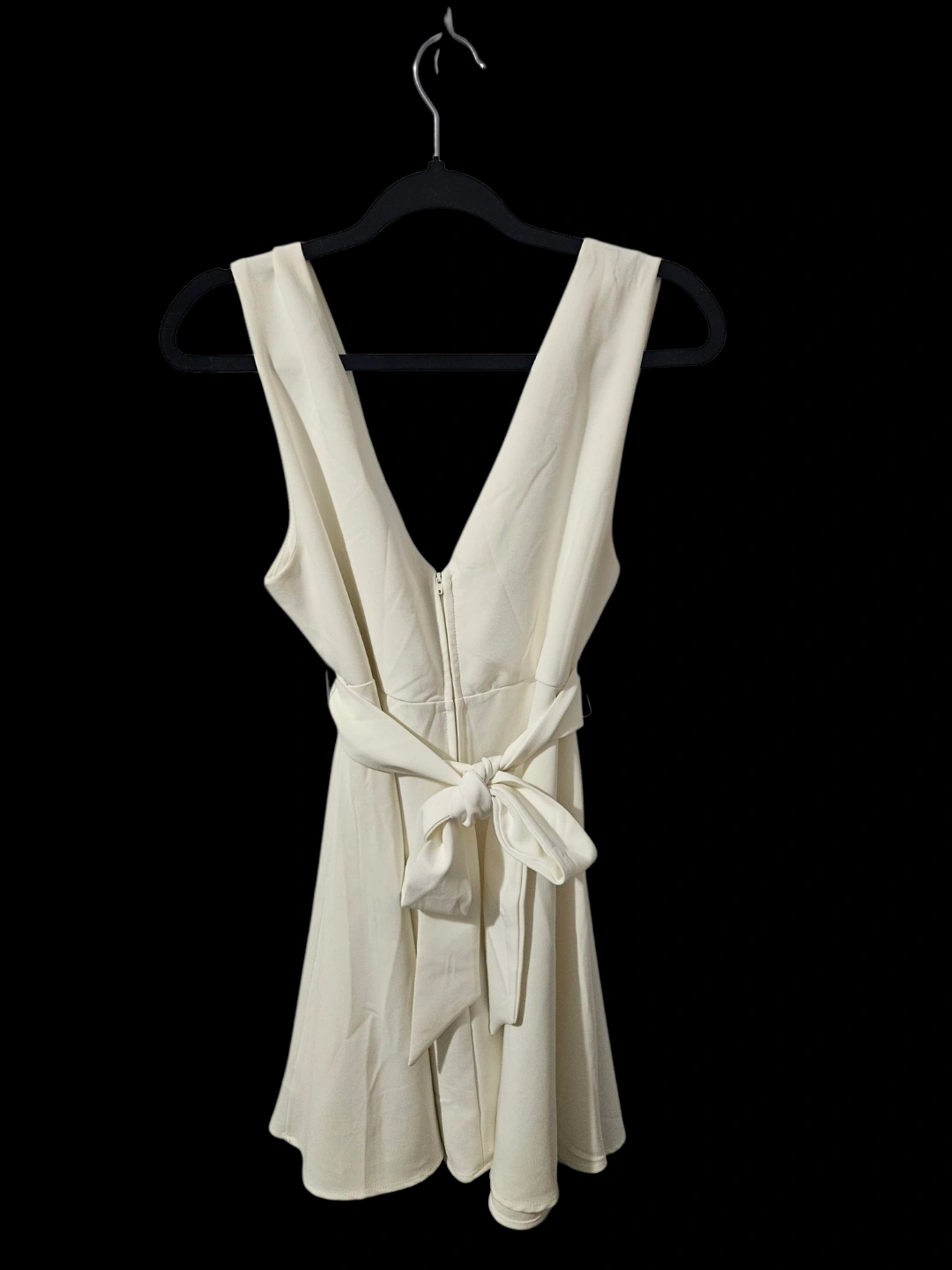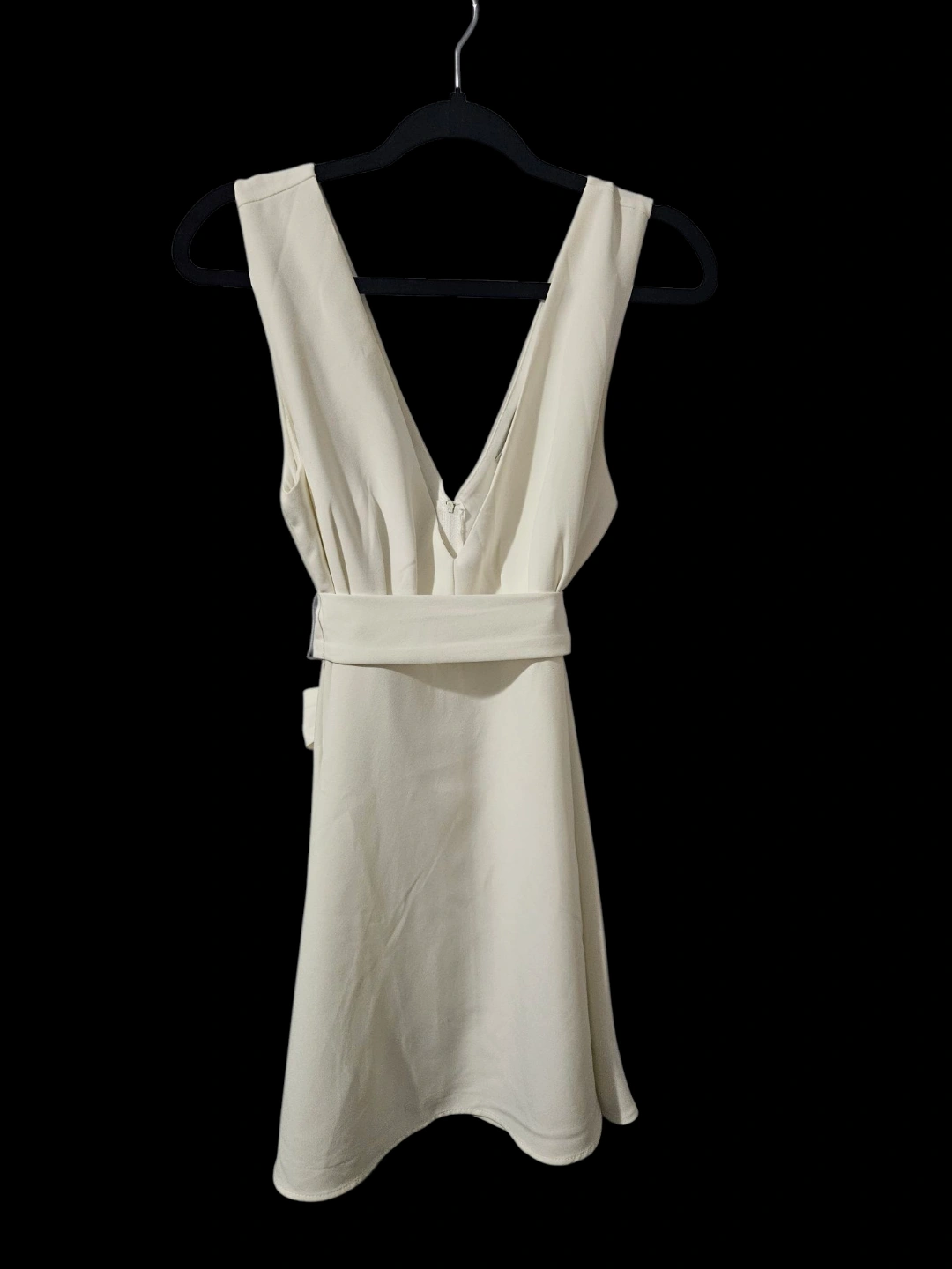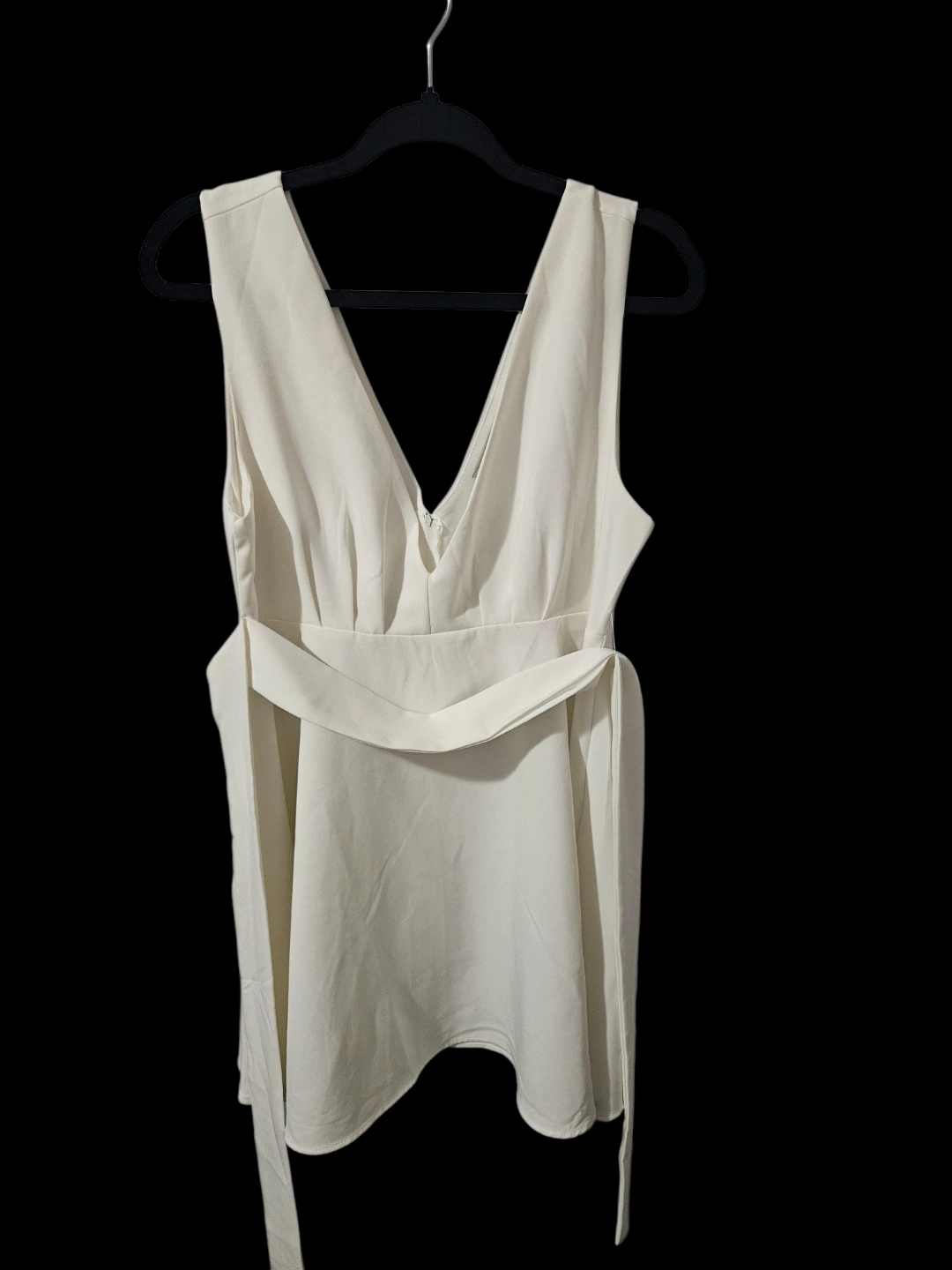 Cream-coloured mini dress. Sleeveless. V-neck. Features a waist tie. Size large. 100% polyester.