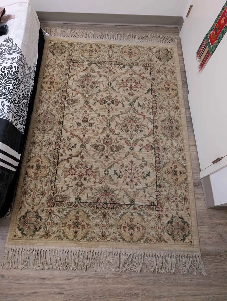 60Add a cozy, classic touch to any space with this lovely vintage-look accent rug. Perfect for bedrooms, reading corners, entryways, or as a statement piece in your living area! Details: Size: 45 inches (width) × 64 inches (length) – fits small spaces easily Rich vintage pattern; subtle, muted color tones Good used condition – Clean and well kept. Soft underfoot and lightweight for easy moving Highlights: ✓ Ideal for small area coverage, layering, or accent décor ✓ Durable and timeless style – complements modern or traditional decor ✓ Smoke-free and pet-free home. Location: University of Waterloo Residence Area Condition: Used, excellent vintage condition Asking Price: $35