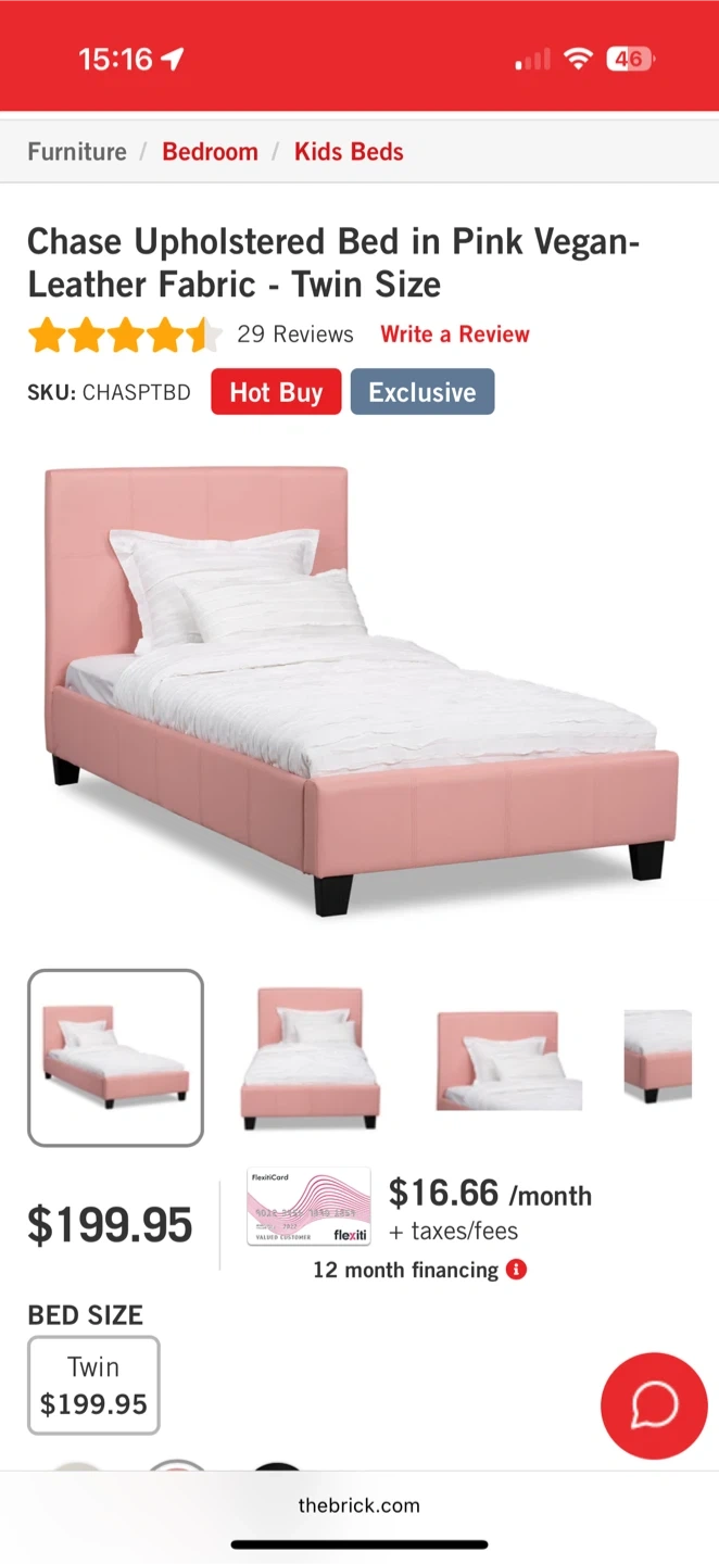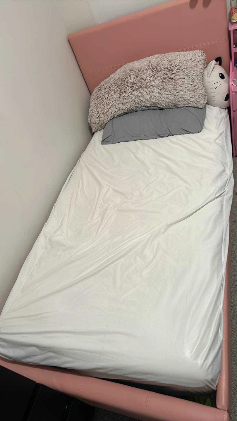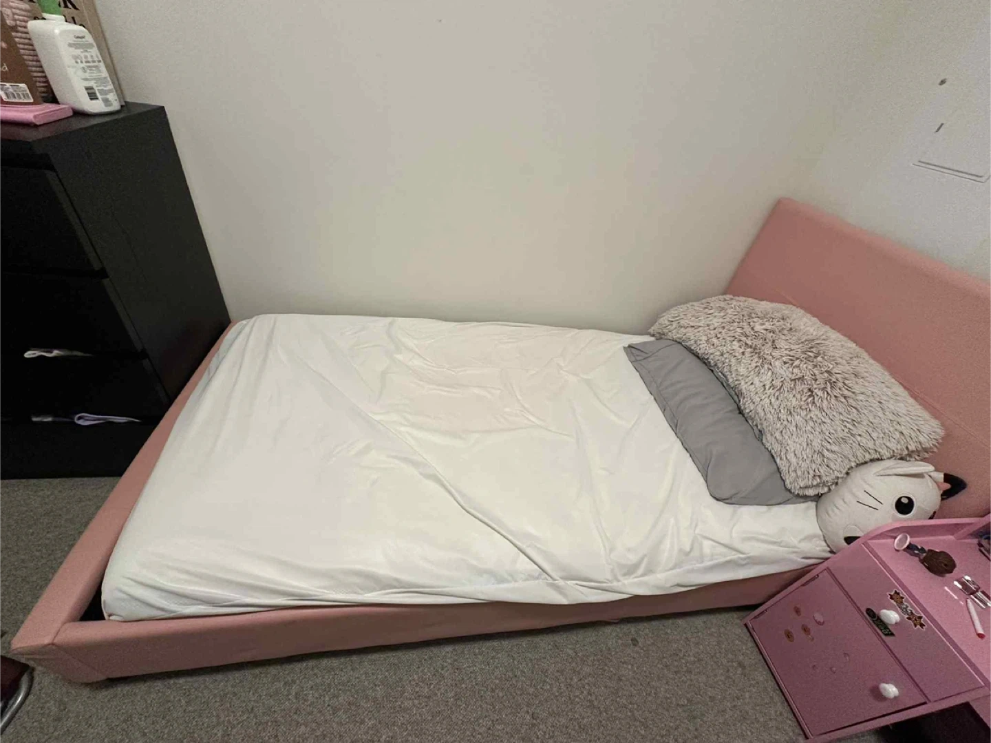 65Selling a Chase upholstered bed in a lovely pink vegan-leather fabric. It's a twin size, perfect for a kid's room or a smaller space. The bed frame is in good condition and ready for a new home! Also, Mattress is like new. No stain! $499 original price. Bed is about $199. This is a good deal. Need gone asap. We need space for a baby room π