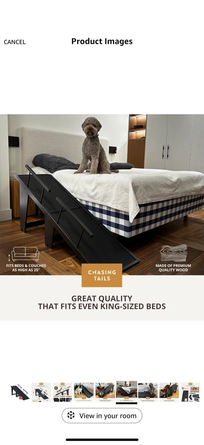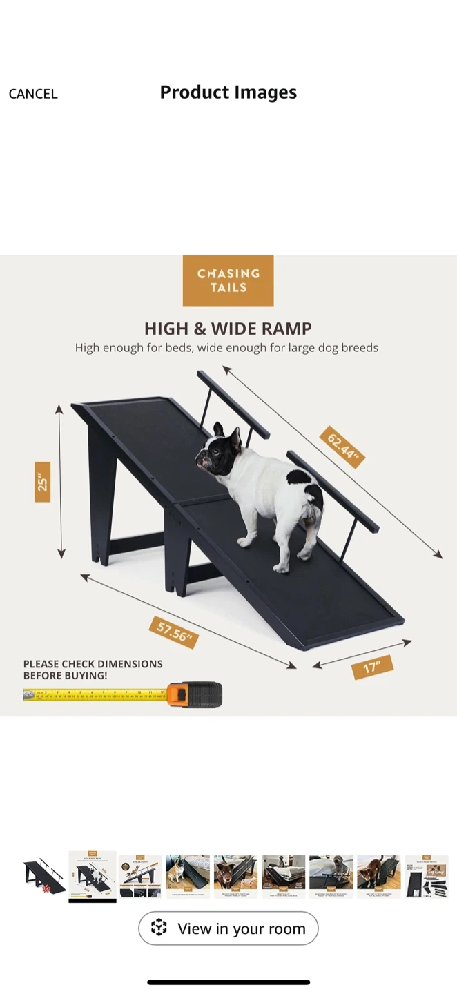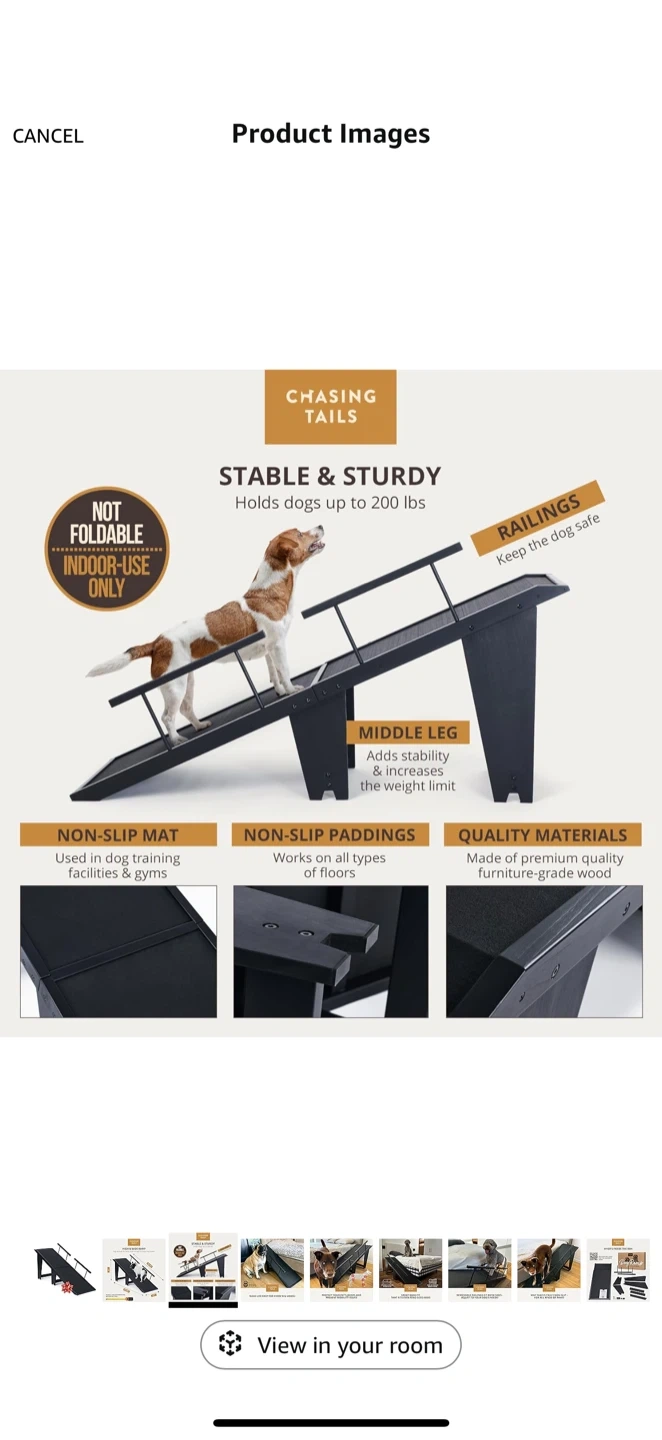 This Chasing Tails dog ramp is designed to be stable and sturdy, holding dogs up to 200 lbs. It features a non-slip mat and non-slip paddings for safety on all types of floors. Made of premium quality furniture-grade wood, it's built to last. The ramp fits beds and couches as high as 25 inches, making it great for even king-sized beds. It has a high and wide ramp suitable for large dog breeds.