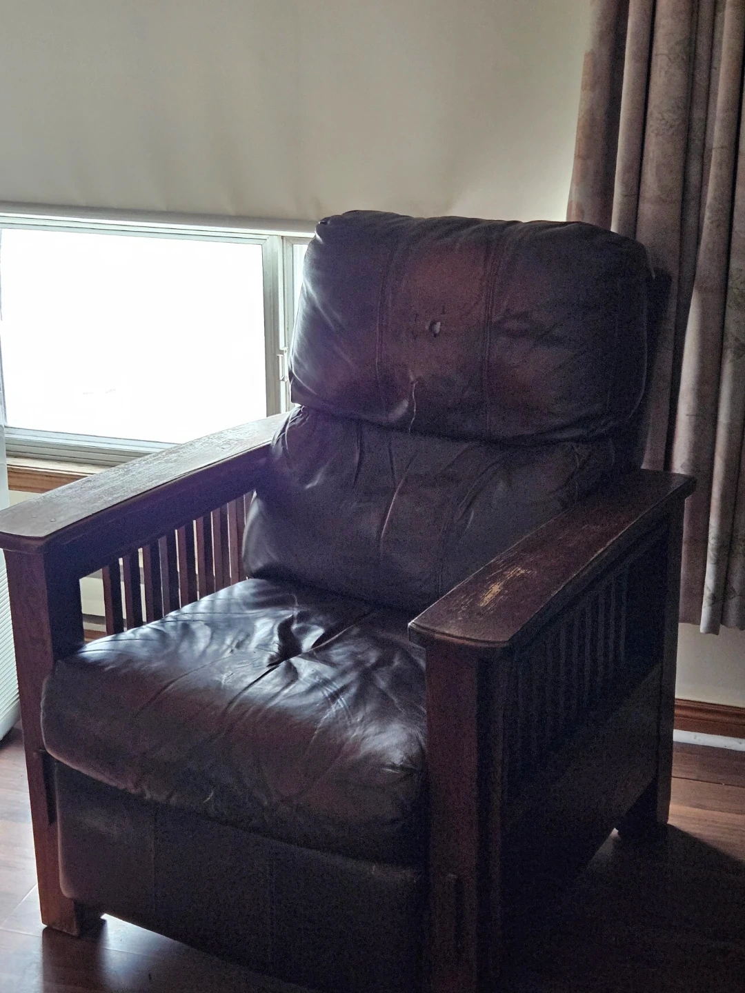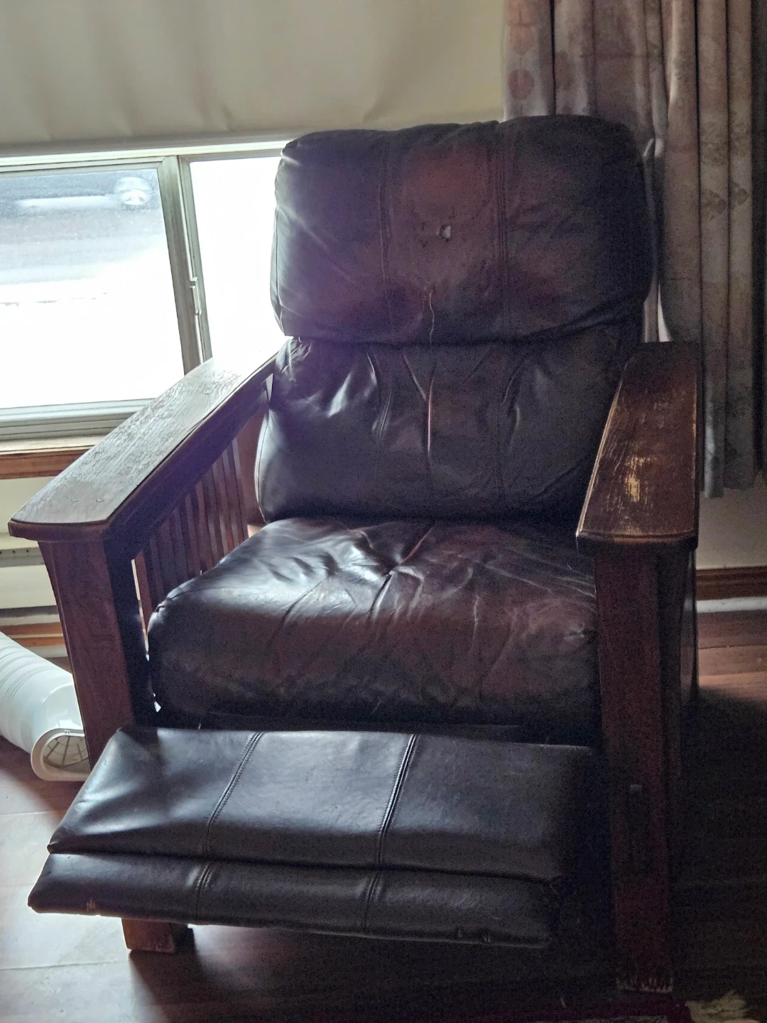 Selling a comfortable leather recliner chair. It's a brown colour and shows signs of wear, as seen in the pictures. Perfect for a cozy living room or den!
