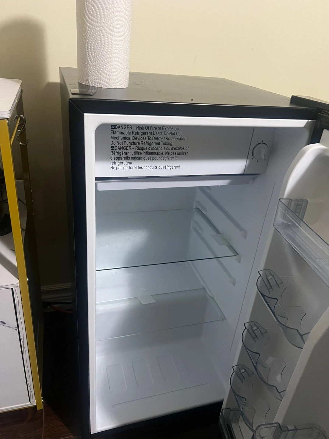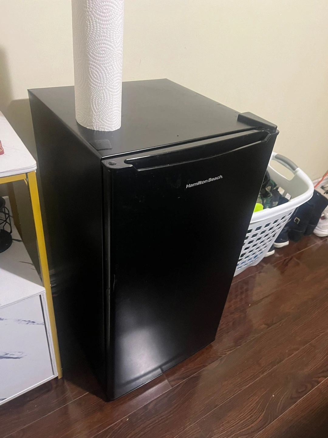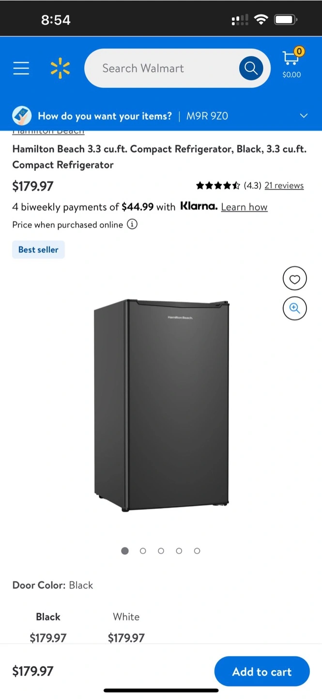 Small black refrigerator. Multiple shelves and door bins. Great for a dorm room or small space. Original price is $178+ tax, around $210. Trade is also available.