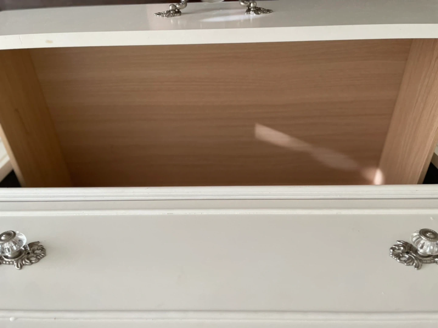 This white dresser features five drawers with decorative silver hardware. Its clean design makes it a versatile addition to any bedroom. The interior wood finish provides a nice contrast to the exterior. It's perfect for storing clothes or linens.