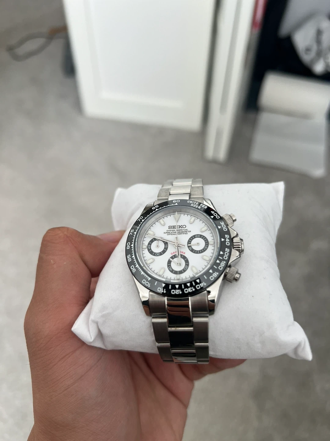 This is a Seiko Perpetual Chronograph watch with a white dial. It's a stainless steel timepiece with multiple subdials and a tachymeter bezel. It comes with an oyster-style bracelet.